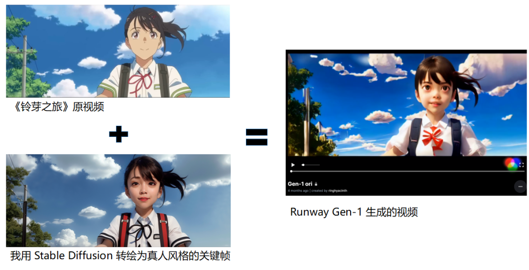 比如我提供了铃芽之旅中的镜头,以及我希望转绘成的真人风格,最后 runway 生成的画面不是很符合我的预期…… ↓