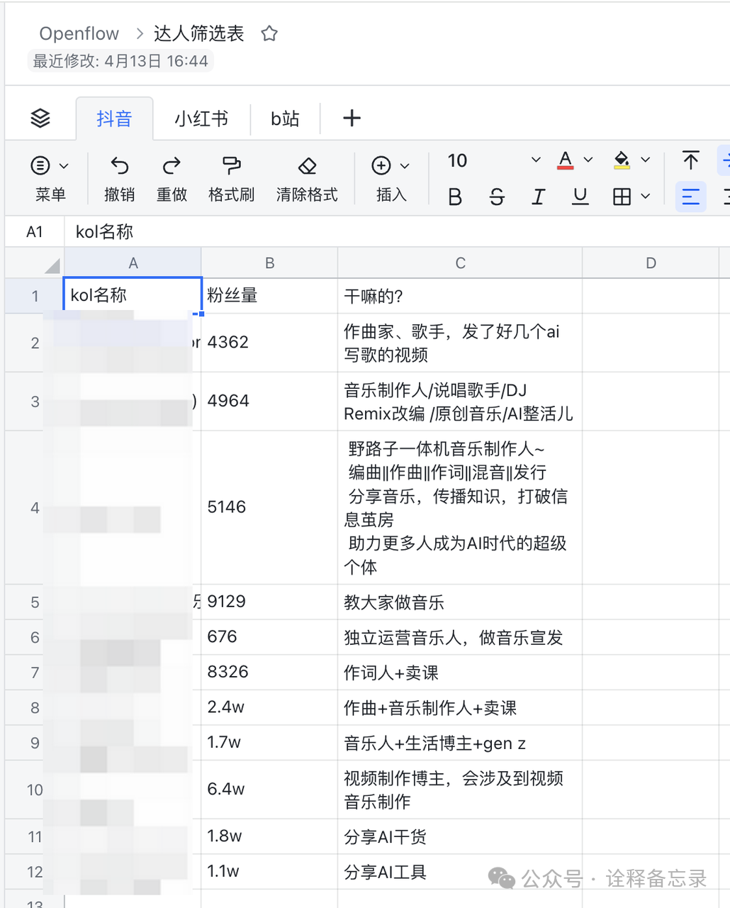 下边是我们做音乐产品时候,筛选的达人表:👇