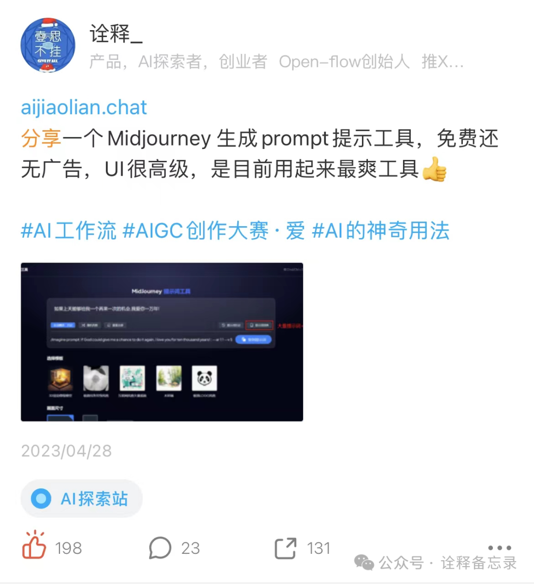 对用户有帮助的文章。比如我们发送 MJ 的最全面使用技巧,他感兴趣看到了,如果你里边稍微提了下你的产品,就会被带出来。内容有用,点赞多就会被权重拉升。