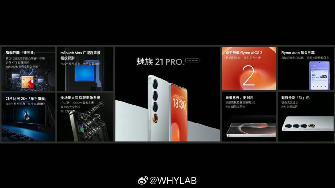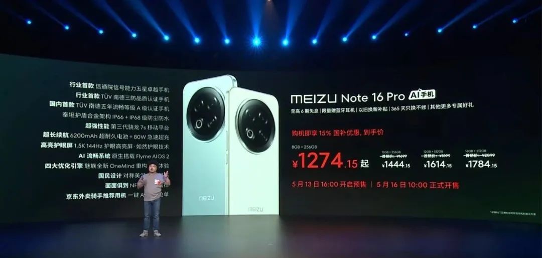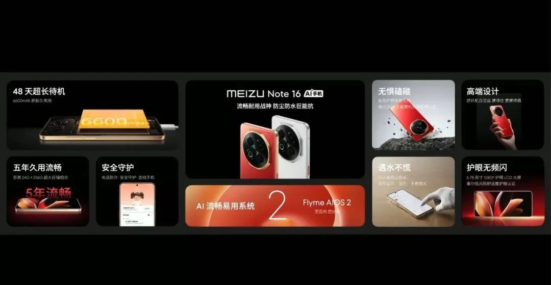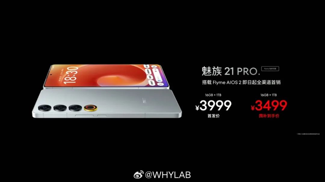 这次发布会一共有三款手机新品,分别是魅族 Note 16、魅族 Note 16 Pro、魅族 Note 21 Pro 钛好用版本。魅族 Note 16 的 8+128GB 售价 799 元(职业补贴+国补后 579.15)、8+256GB 售价 999 元(职业补贴+国补后 764.15)、12+256GB 售价 1099 元(职业补贴+国补后 934.15)。- 芯片:紫光展锐 T8200 Flyme 特调满血版(展锐 T765)移动处理平台,LPDDR4X 内存;- 屏幕:6.78 英寸 2460×1080 LCD 直屏,支持 120Hz 刷新率,全局最高亮度 1050nit,真 DC 调光,支持湿手触控;- 相机:前置 8MP(海力士 Hi864,f/2.0),后置 50MP 主摄(三星 S5KJN1,1/2.76",f/1.8)+ 2MP 景深(格科微 GC02M1B)双摄;- 续航:6600mAh 电池,支持 40W 快充,兼容 QC3.0、QC2.0、QC3+ 协议;- 其他:厚 9.18mm,重 216.9g,雪玉白、磐石黑、赤子红 3 款配色,单扬声器、IP65 防尘防水、侧边指纹识别、单频 GPS + 单频北斗,配备独立 AI 按键,转子马达,首发 Flyme AIOS 2 系统。魅族 Note 16 Pro 发布,8+256GB 售价 1499 元(国补 1274.15)、12+256GB 售价 1699 元(国补 1444.15)、12+512GB 售价 1899 元(国补 1614.15)、16+512GB 售价 2099 元(国补 1784.15)。- 芯片:骁龙 7s Gen 3 移动处理平台,LPDDR4X 内存,4466mm² VC 均热板;- 屏幕:6.78 英寸 2720×1224 OLED 直屏,支持 144Hz 刷新率,手动最高亮度 700nit,全局激发亮度 1600nit,局部激发亮度 4500nit,2160Hz 高频 PWM 调光,支持湿手触控;- 相机:前置 8MP(海力士 Hi864,f/2.05),后置 50MP 主摄(豪威 OV50C40,1/2.5",f/1.8)+ 8MP 超广角(海力士 Hi864,f/2.2)双摄;- 续航:6200mAh 电池,支持 80W 快充,22 分钟充电 50%、53 分钟充电 100%,兼容 QC4+、PD 3.0、PPS 协议;- 其他:厚 8.4mm,重 197.5g,流云白、轻舟蓝、逐星灰 3 款配色,支持 NFC、红外遥控、立体声双扬声器、IP66 & IP68 防尘防水、双频 GPS + 三频北斗,配备独立 AI 按键,Z 轴线性马达,首发 Flyme AIOS 2 系统。魅族 21 Pro 钛好用.ver 版本搭载 Flyme AIOS 2,搭配全新钛色,16GB + 1TB 国补到手价 3499 元,本身挺好看的,这个 24K 金灵动环有点没绷住。