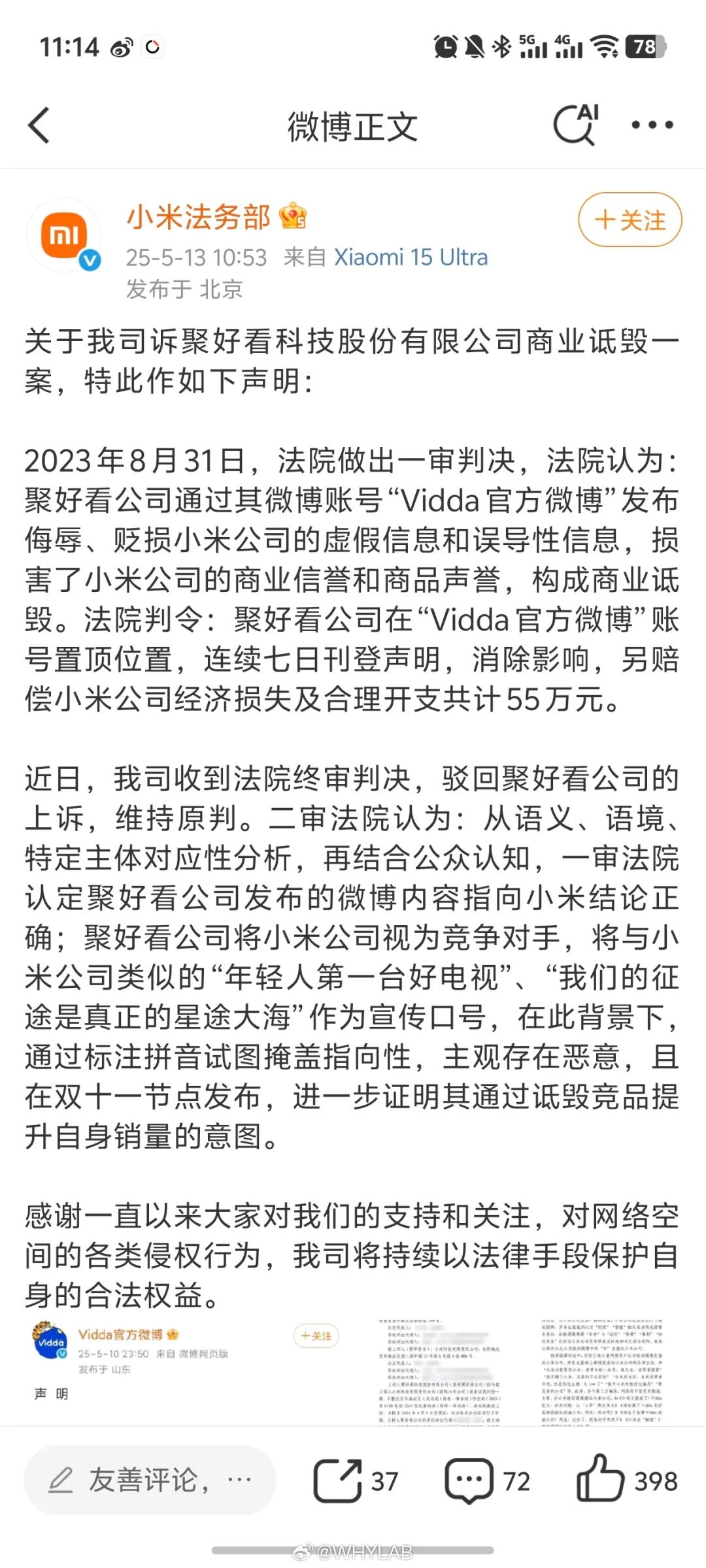 小米法务部也对公布了 Vidda 官博侮辱、贬损小米公司一案的判决,Vidda 官博也置顶了这次本次时间的道歉,但 Vidda 官博下的评论区狂欢带节奏比事件本身更难绷。(图四部分评论区截图)