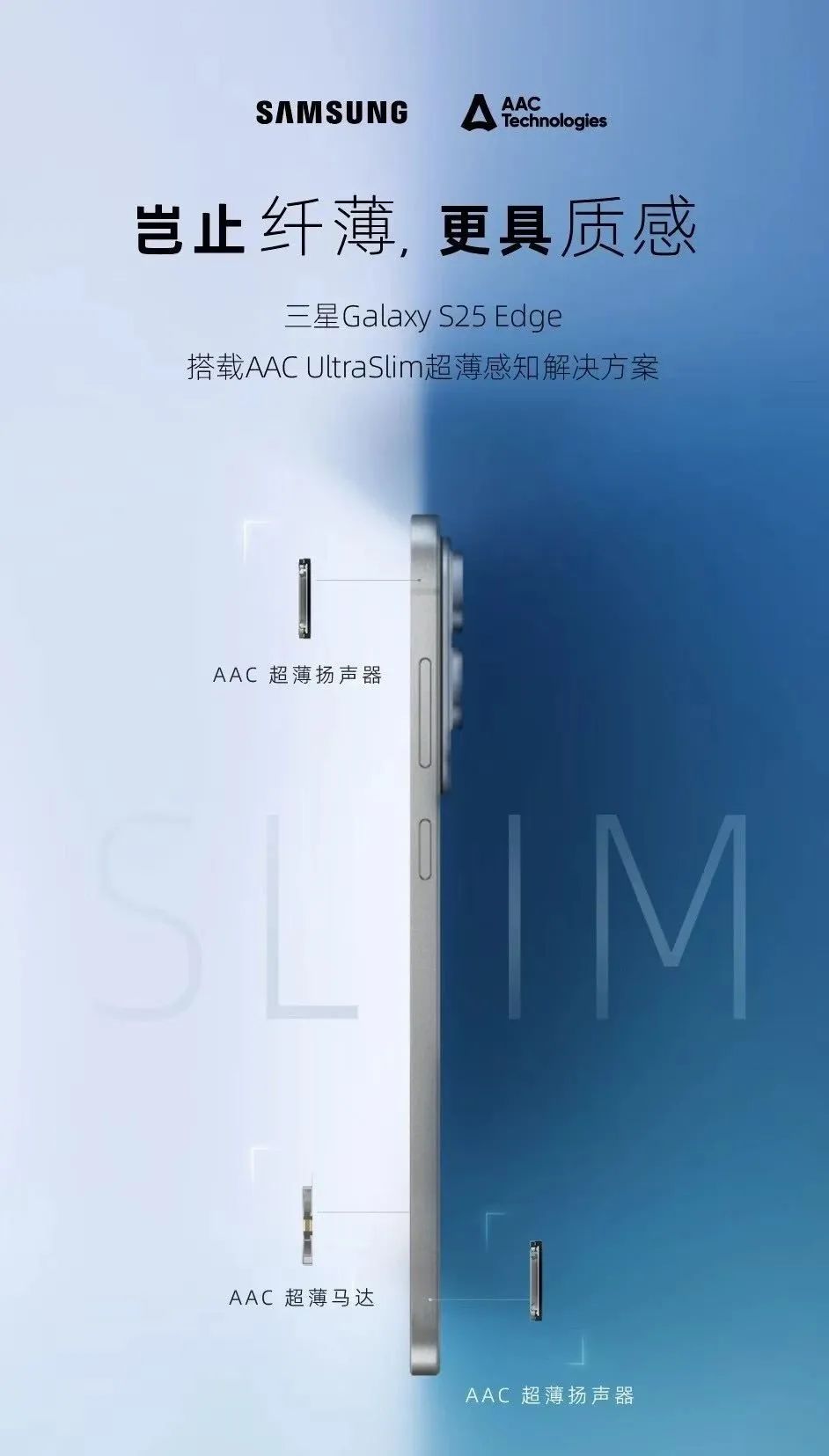 - 芯片:骁龙 8 至尊版 For Galaxy;- 屏幕:6.7 英寸 3120×1440 AMOLED 直屏,支持 120Hz 刷新率,康宁大猩猩 Ceramic 2 玻璃;- 相机:前置 12MP(f/2.2),后置 200MP 主摄(OIS,f/1.7)+12MP 超广角(f/2.2)双摄;- 其他:厚 5.8mm,重 163g,钛银、钛蓝、钛黑 3 款配色,搭载钛金属边框、康宁大猩猩 Victus 2 玻璃背板,支持 IP68 防尘防水,蓝牙 5.4,Wi-Fi 7,UWB 超宽频,USB 3.2 Gen 1,搭载 One UI 7 系统。ACC Inside!瑞声科技为三星 Galaxy S25 Edge 提供超薄双扬声器以及超薄马达。