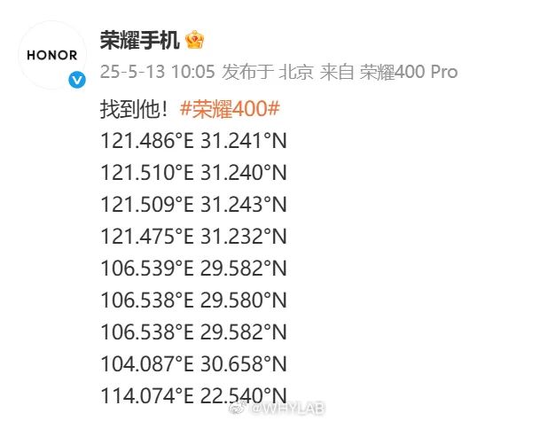 荣耀 400 系列开始预热,最新微博的坐标已有破解,分别是上海、重庆、成都、香港(图二),评论区已经有高手拍到了,肖战粉丝们可以去实地打个卡。