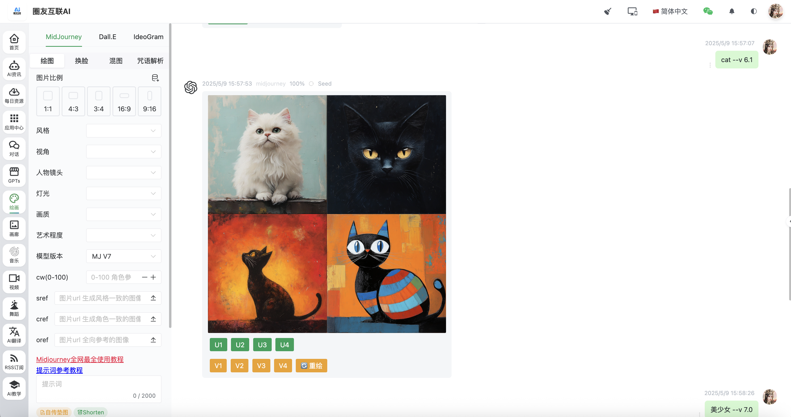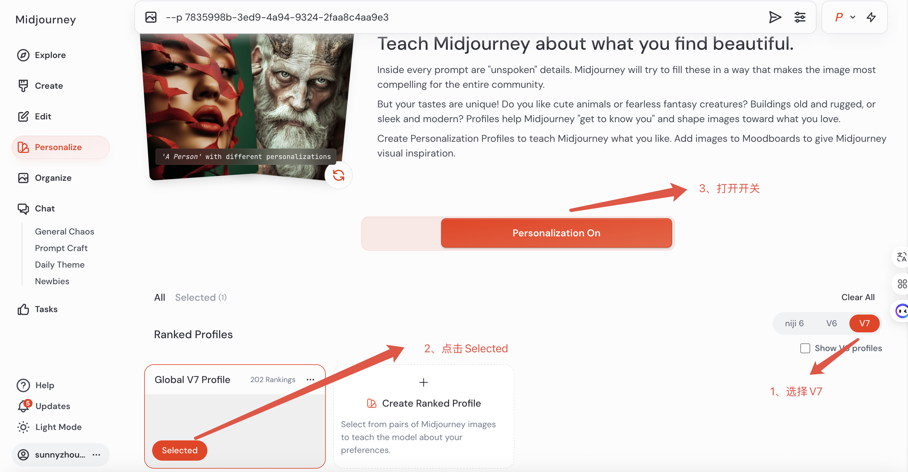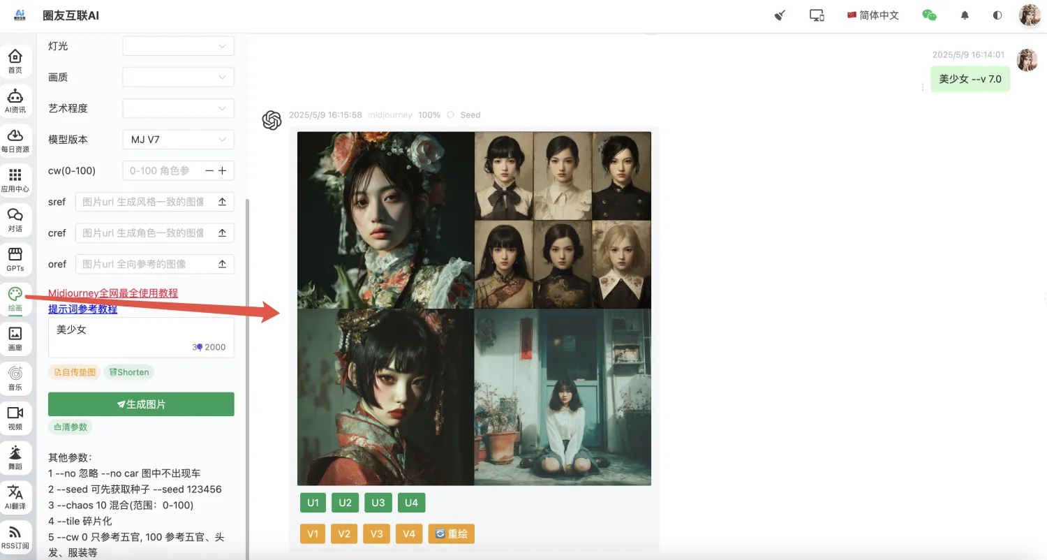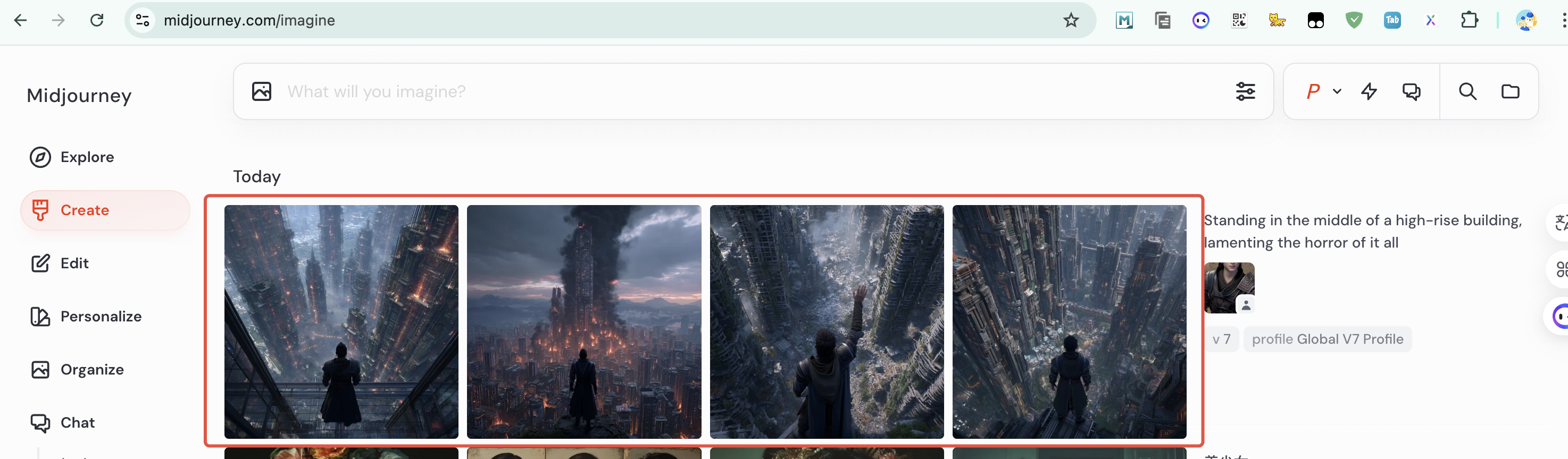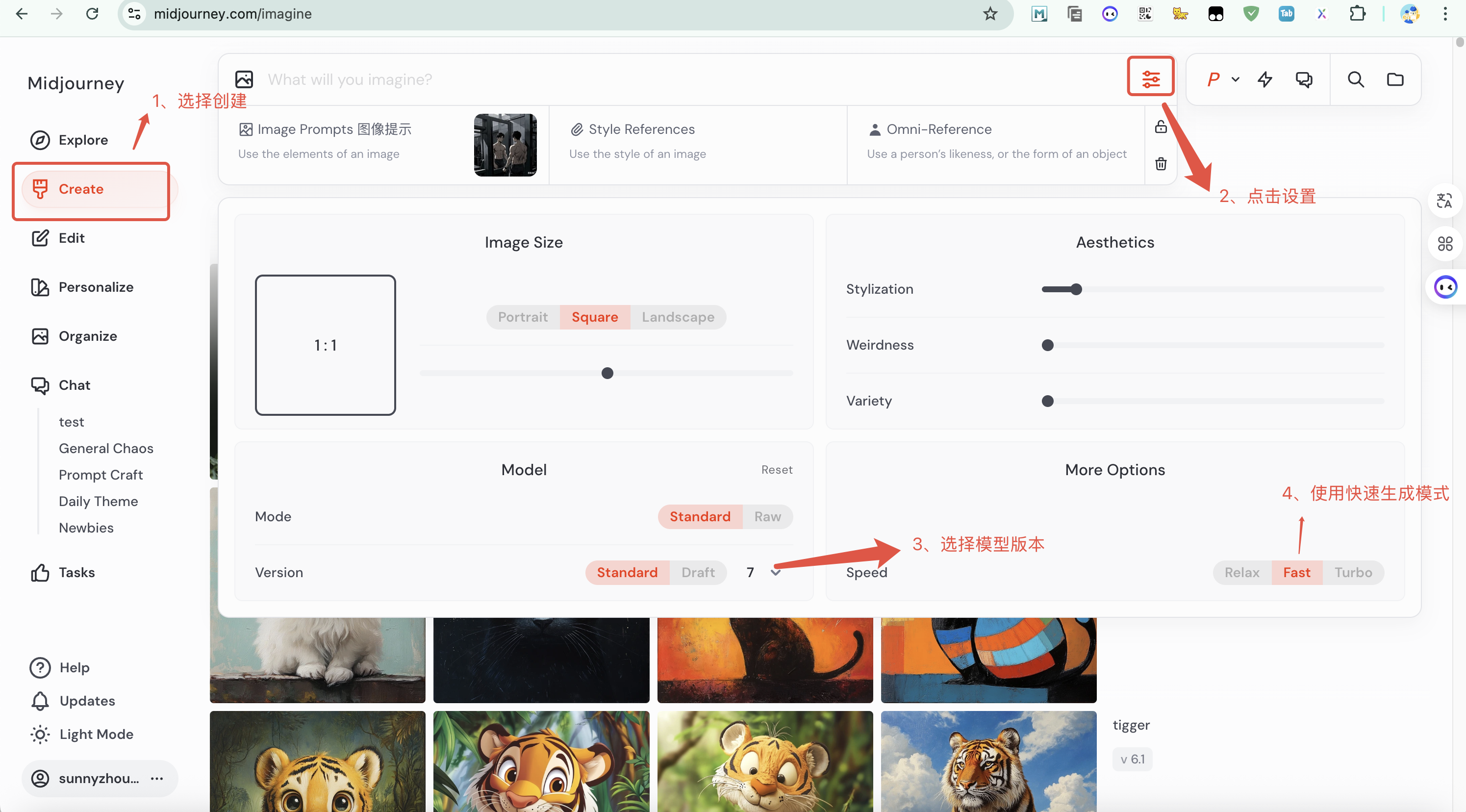 地址:https://www.midjourney.com/imagine,进到Create界面,点击设置,选择好V7模型