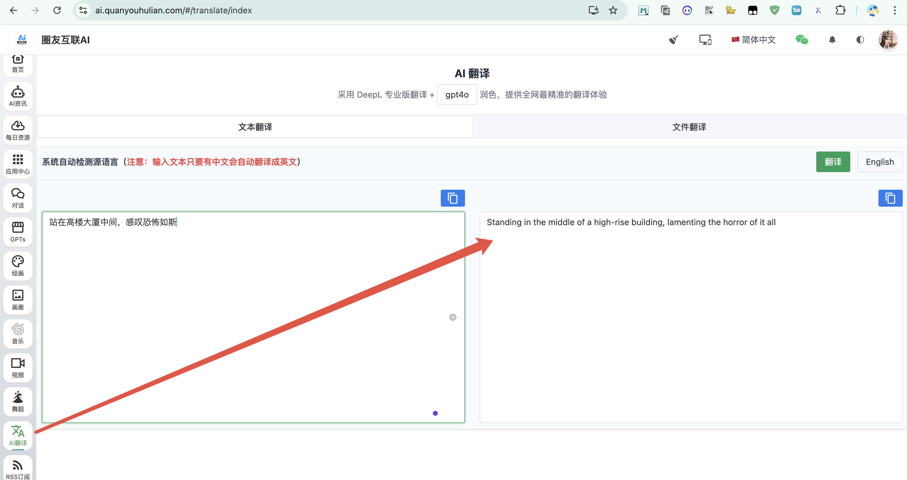 由于midjourney无法识别中文,这里我们对它进行一道翻译,去AI翻译软件:https://ai.quanyouhulian.com/#/translate/index