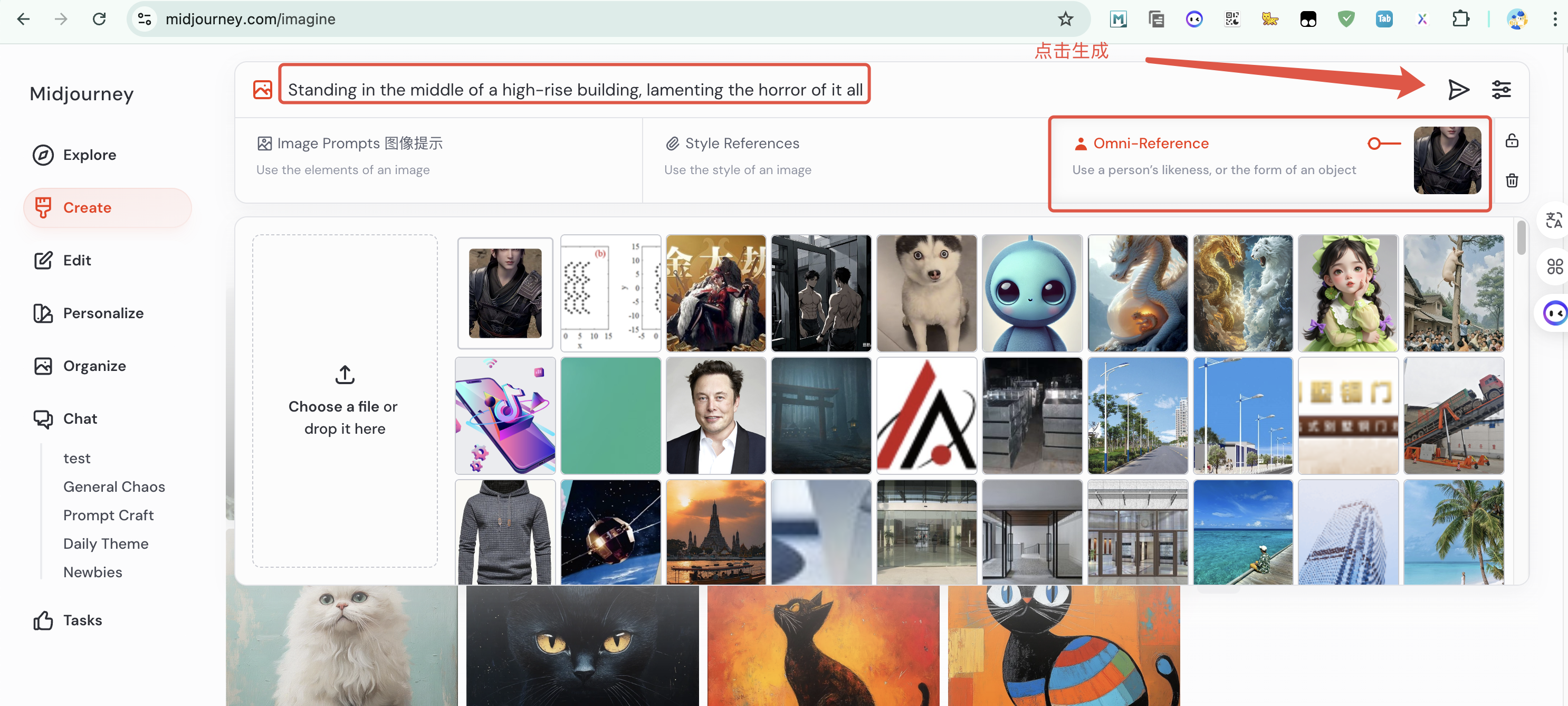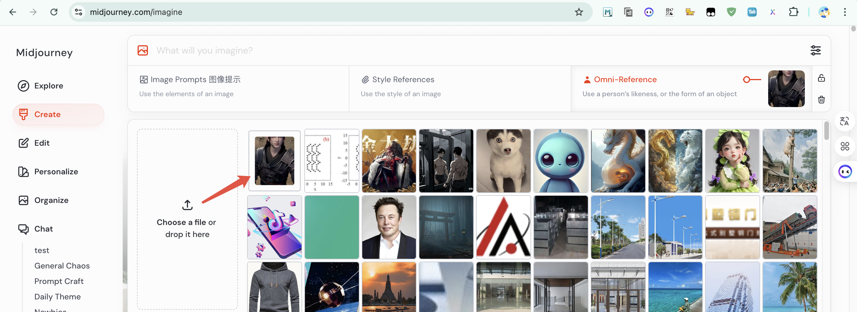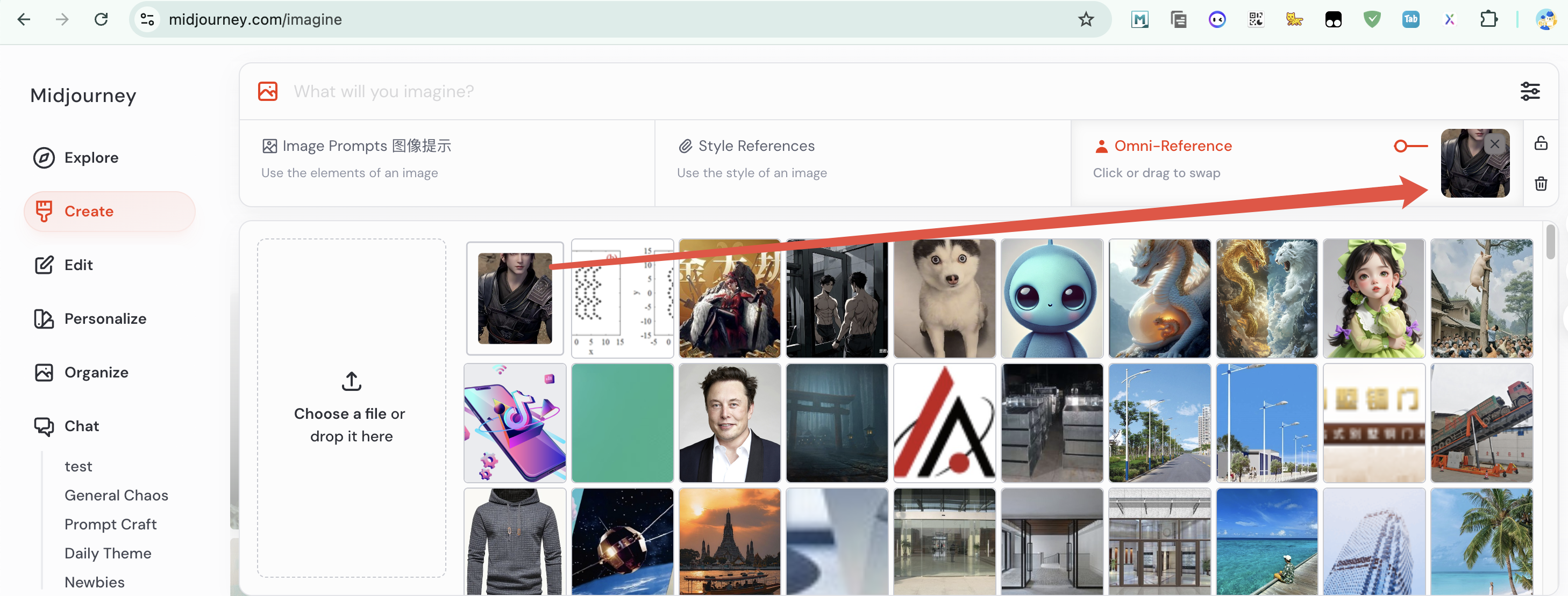点击Omni-Reference右侧Select Image below按钮,选择素材库里面的图片(注意:单次仅支持一张参考图)
