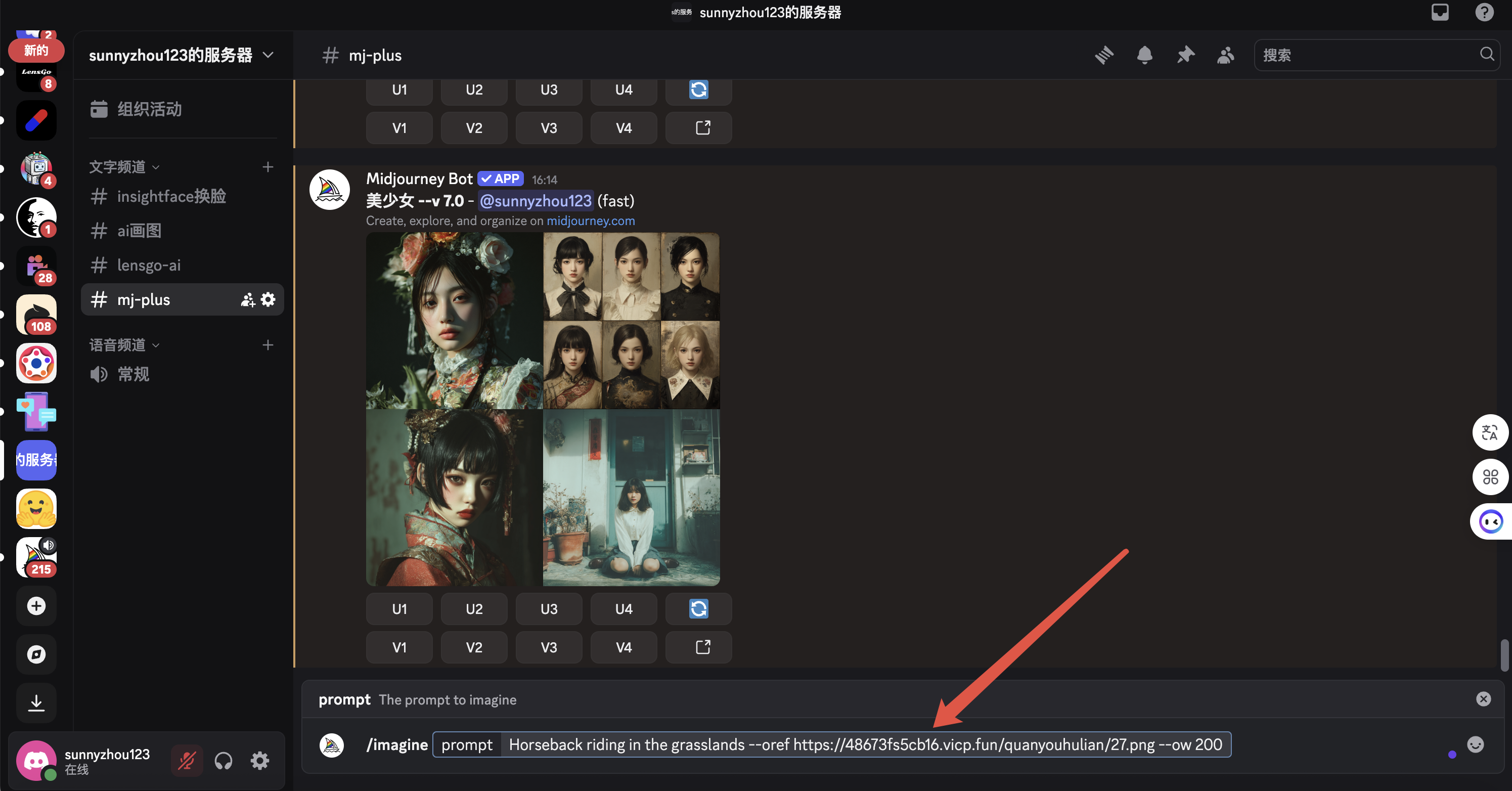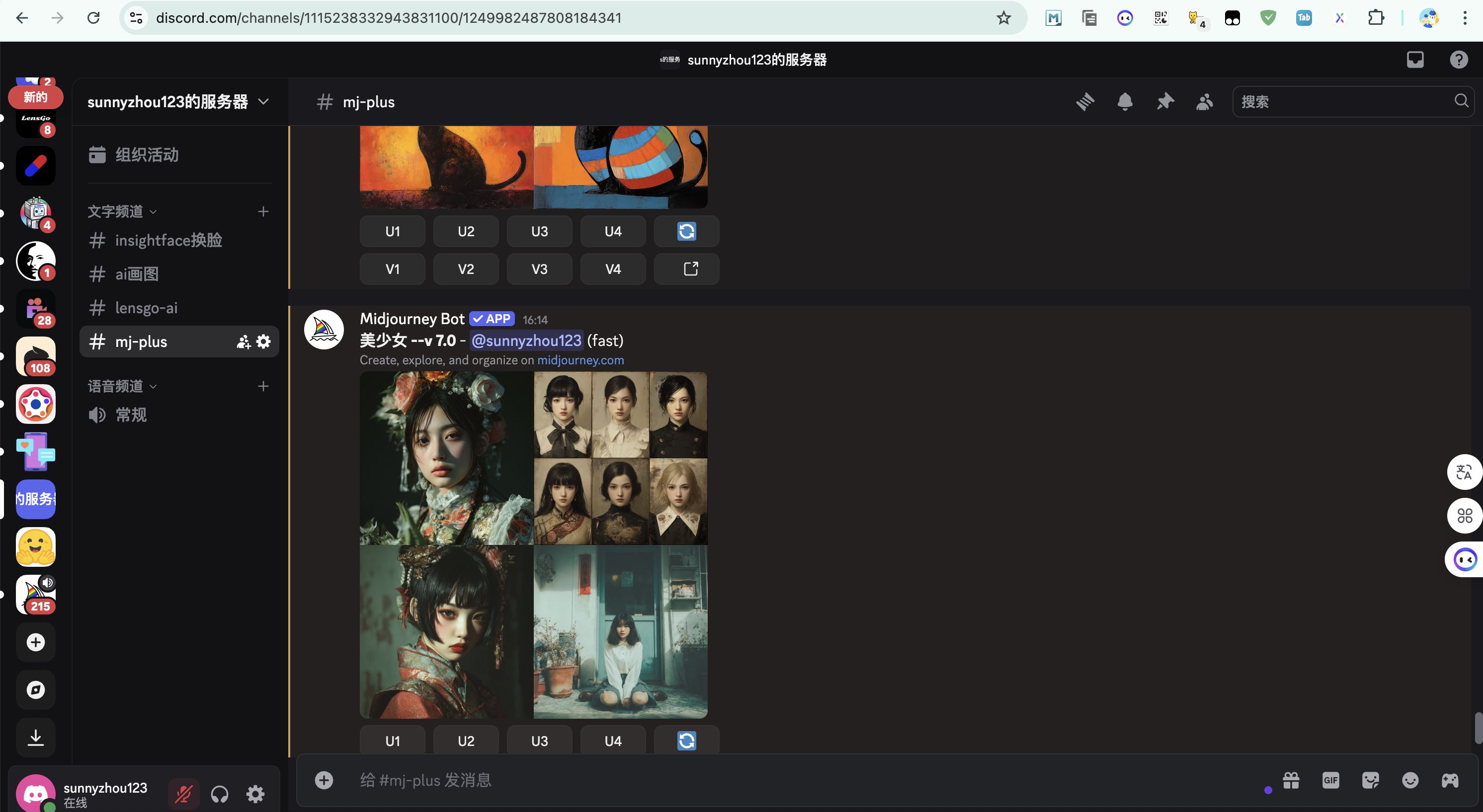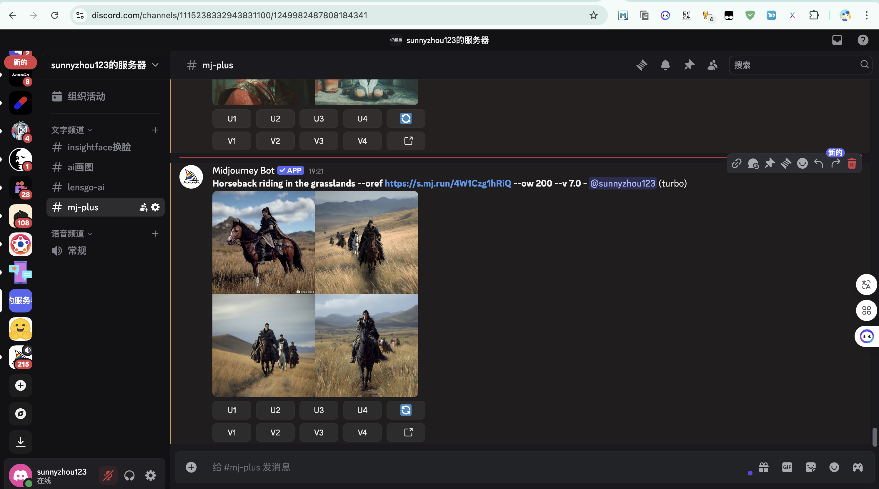 地址:https://discord.com/channels/,这里需要自己创建个频道,然后把Midjourney Bot机器人邀请到自己频道里面