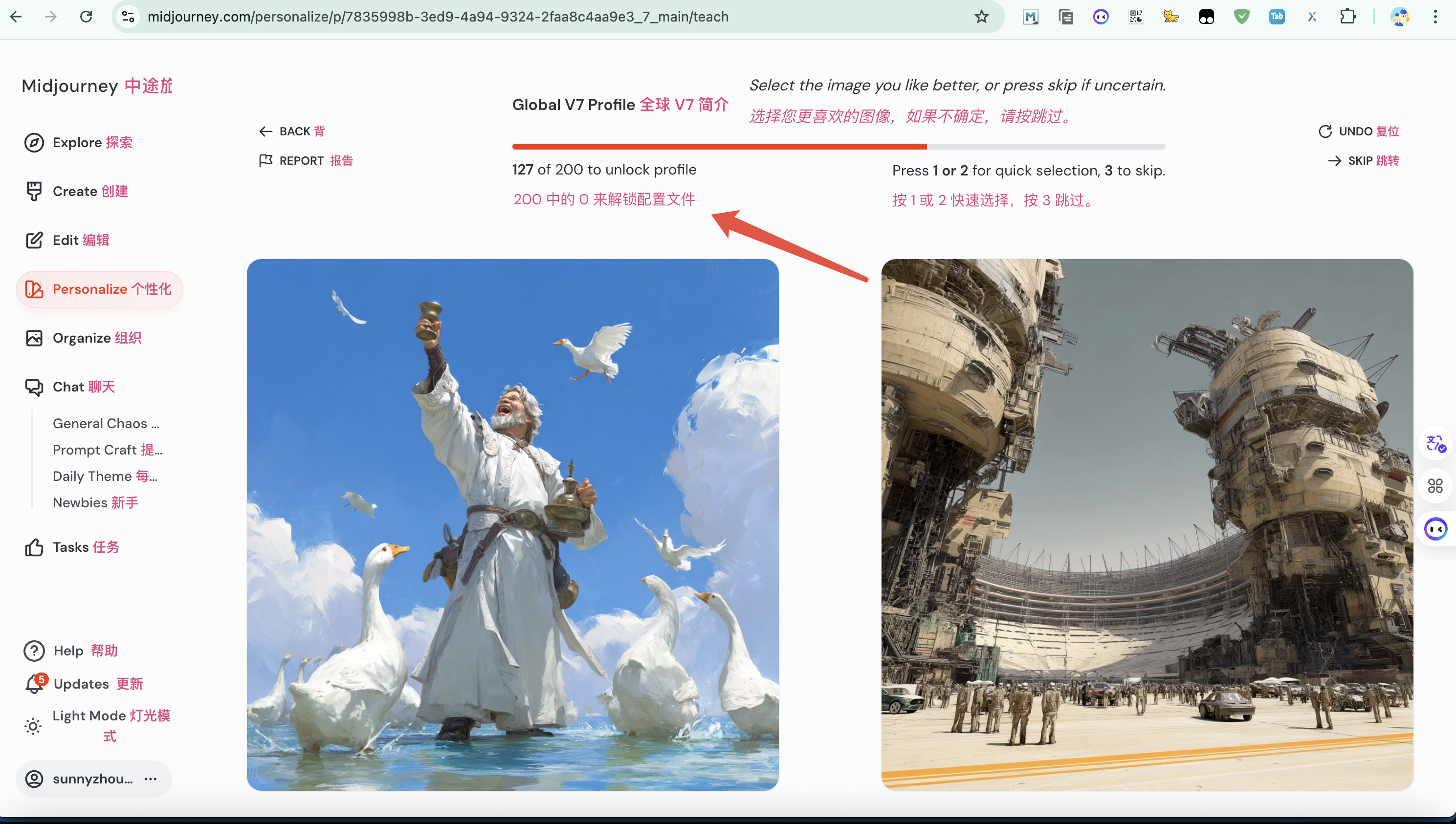 点击提示信息里的Unlock personalization链接,跳转到midjourney官网,完成200张图片的风格偏好选择