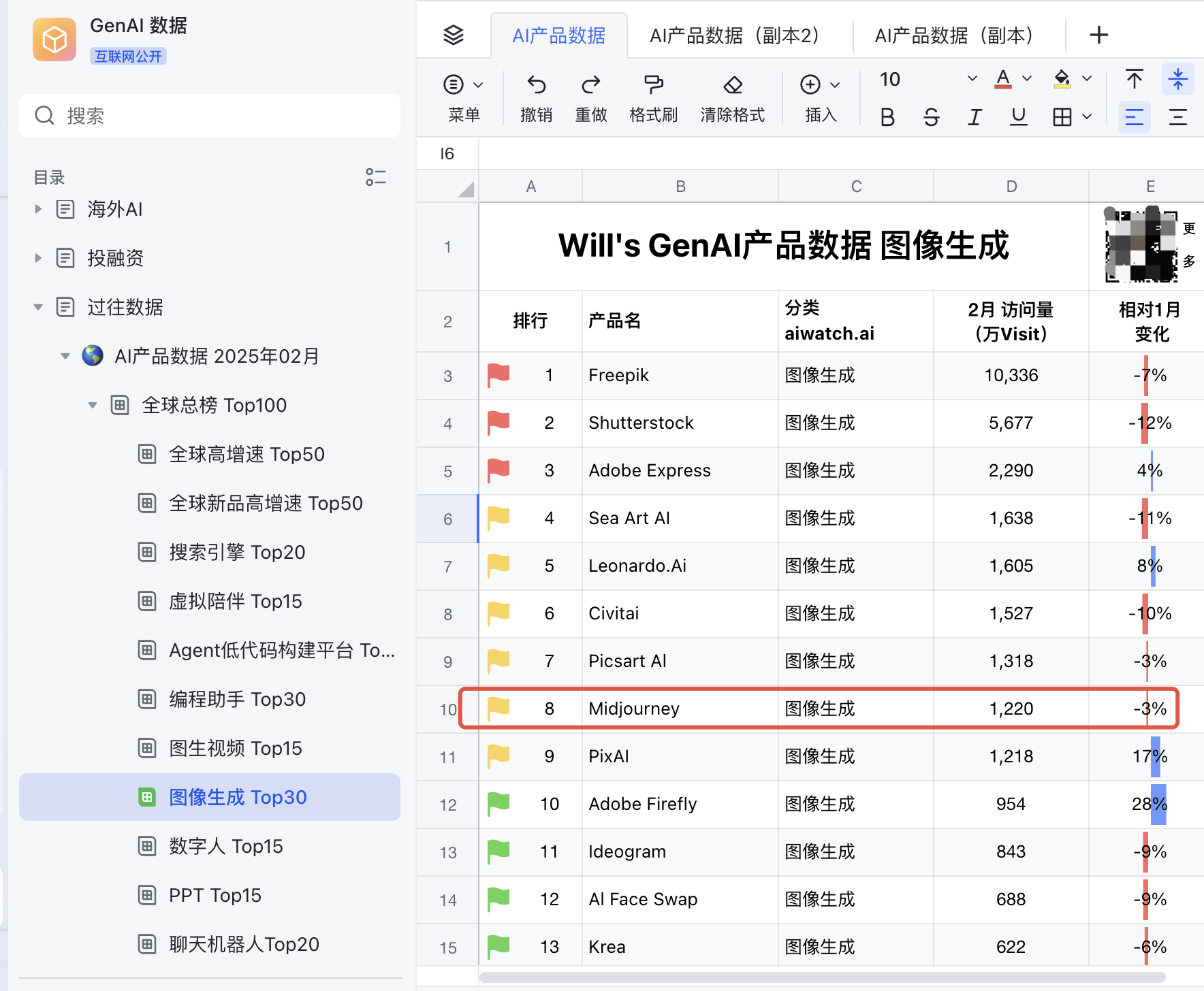 作为AI绘画界的老牌领军产品,从最新的文生图访问数据排行榜可以看出,Midjourney的访问量正在逐渐下滑!本次我将和大家详细讲解下Midjourney的V7版本都**做了哪些更新、实测效果以及如何免费体验V7功能**,看下Midjourney是否能凭借本次重大版本升级重回巅峰!