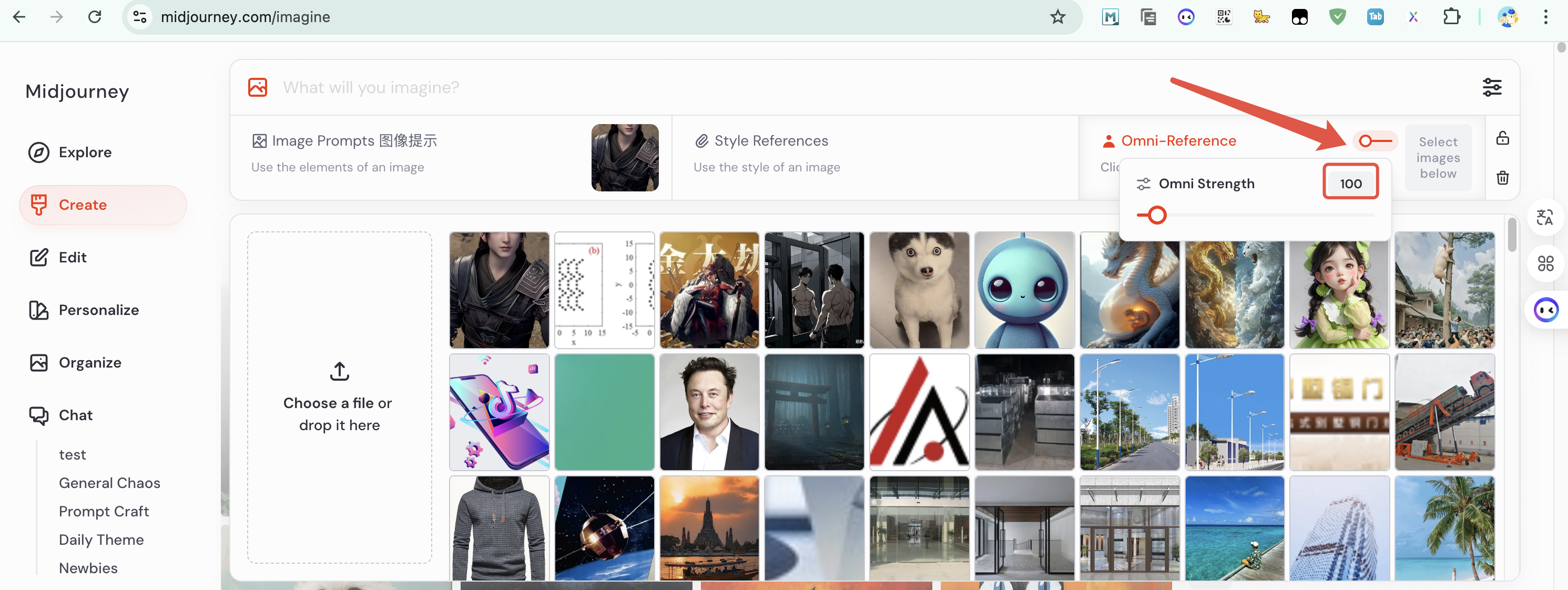 点击Omni-Reference右上角滑块,就可以调整权重值,可选值是0-1000,默认是100,对应的discord里参数--ow!如果你想改变图像的风格(如将照片改为动漫),则应降低权重,比如调到25!如果想确保角色的脸部非常明显(或他们的衣服得到保留),则应尝试更高的设置,比如设置到400!这里我们直接使用100默认值进行测试
