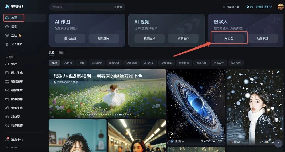 打开即梦AI:https://jimeng.jianying.com/s/DawYq5kUOnU/?t=-4,进到首页后,点击对口型