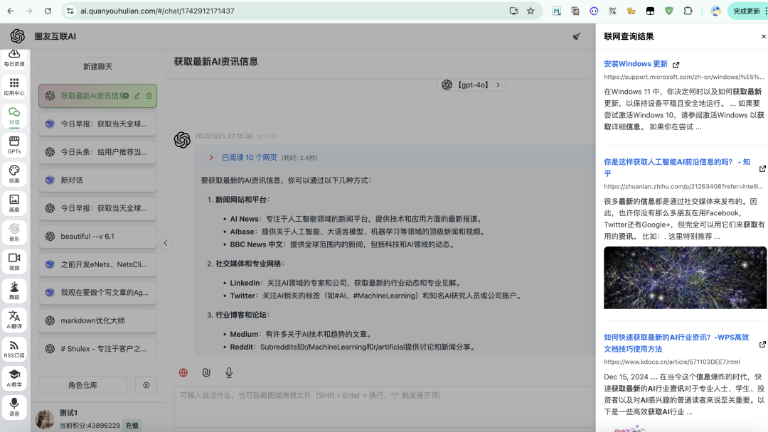 https://ai.quanyouhulian.com/,目前对话已上线联网功能,支持(100+搜索引擎)