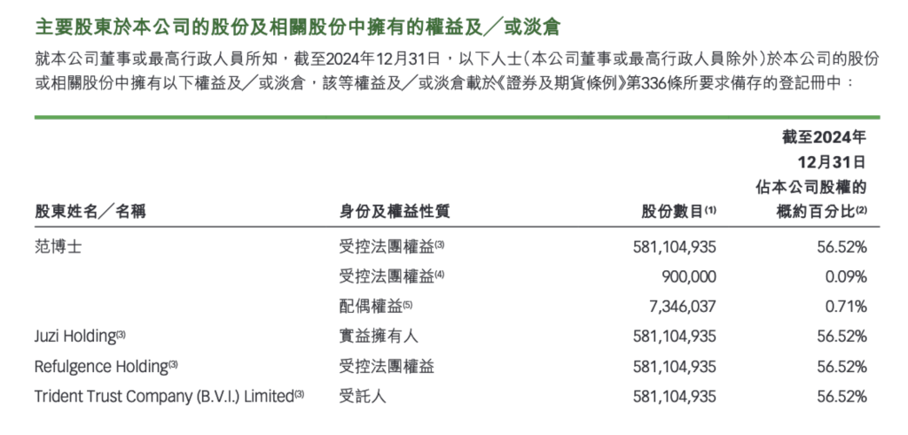 此外,根据港交所披露的股东权益显示,截至2025年4月28日,范代娣持有公司5.89亿股,股权占比55.03%,其中734.6万股为范代娣配偶权益, 5.82亿股为范代娣所控制的法团的权益。