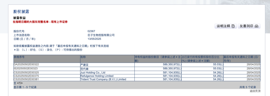 根据2024年巨子生物年报显示,截至2024年12月31日,Juzi Holding由Refulgence Holding全资拥有,Refulgence Holding是以FY Family Trust为受益人的控股工具,其中范代娣为委托人及受益人。RefulgenceHolding由Trident Trust Company (B.V.I.) Limited以FY Family Trust为受益人作为受托人合法拥有。因此,范代娣、Refulgence Holding及Trident TrustCompany (B.V.I.) Limited均被视为于Juzi Holding所持的本公司5.8亿股股分中拥有权益。