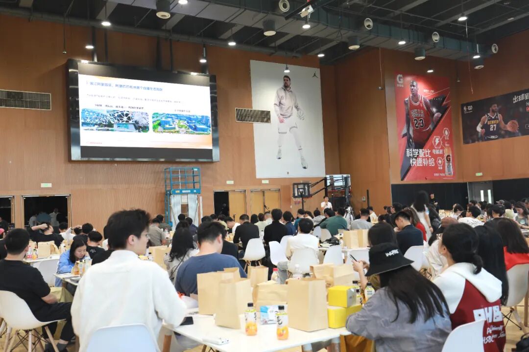 之所以找这个场地,就是因为人数有点多,这次300多个人,还需要吃席一样的放桌子,所以找了个,阿里园区里面巨大篮球场。
