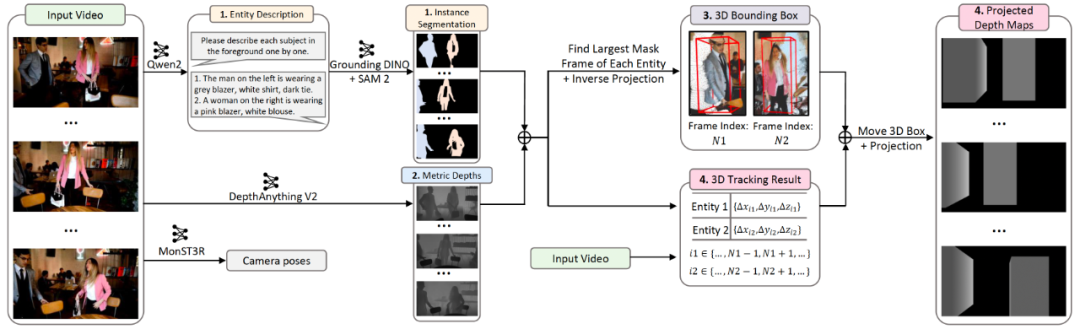 访问由 Spatial Tracker 实现的 3D 点跟踪结果,计算所有目标在视频序列中的 3D bounding box,并投影整个 3D 场景得到深度图。