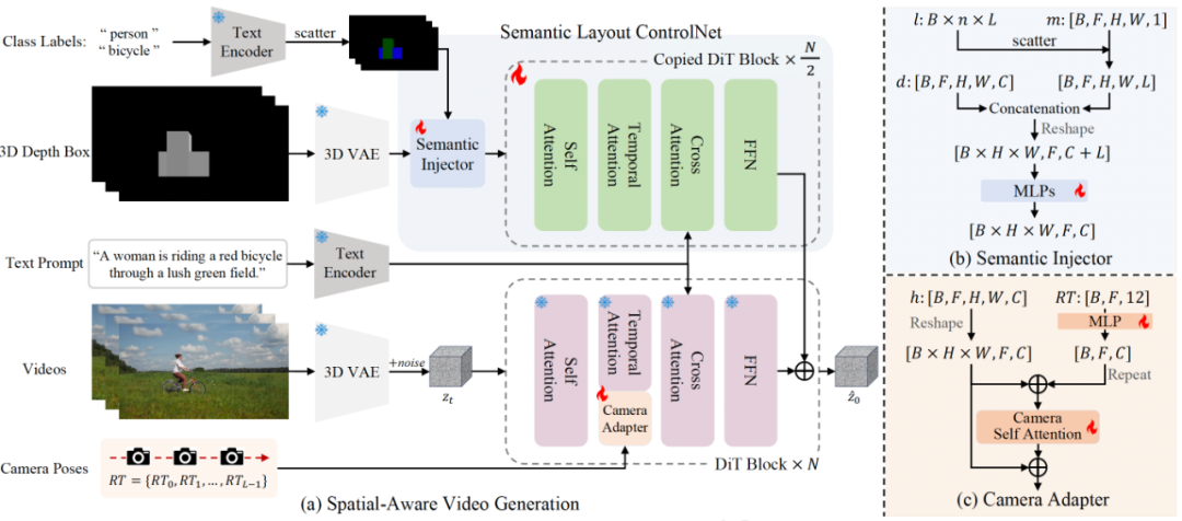 阶段 2:如图所示,该方法框架通过语义布局 ControlNet 的架构集成了物体的运动控制信号和物体的类别标签信息,从而明确地控制每个目标的运动。此外,通过 Camera Adapter 集成了相机运动控制信号表示视频序列的全局运动。