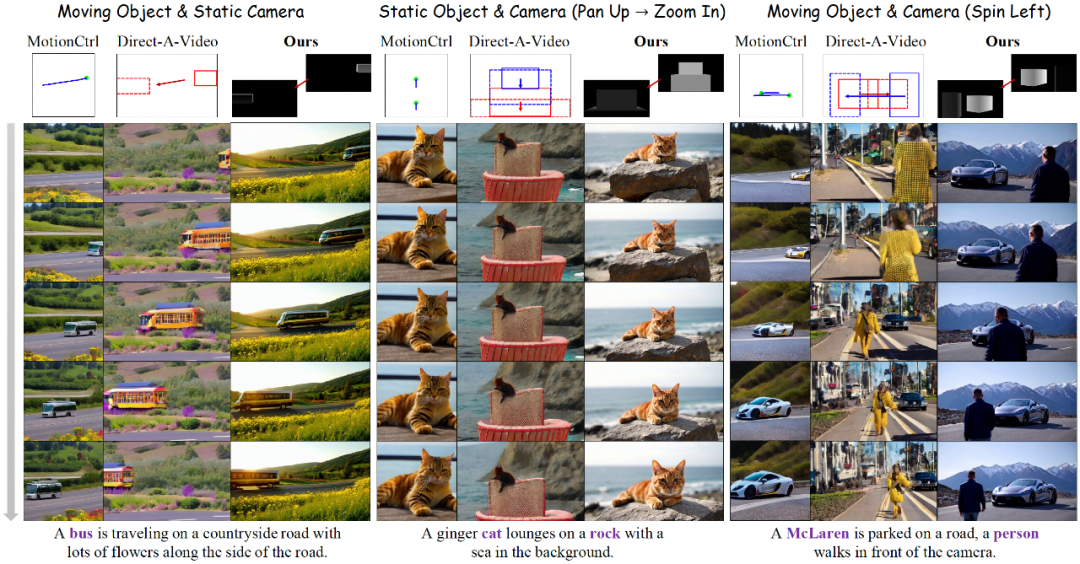 可以观察到,CineMaster 可以根据用户提供的多模态细粒度的控制信号生成期望的视频,支持较大幅度的目标、相机运动的可控生成。