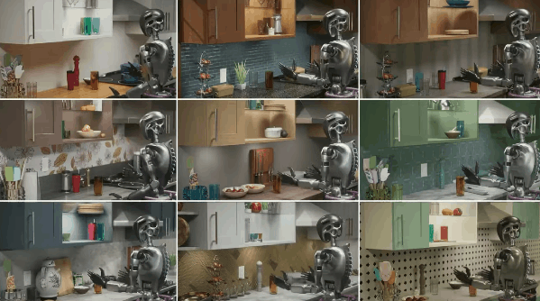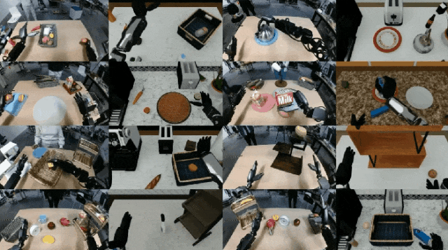 将所有这些放在一起,我们构建了一个名为 RoboCasa 的框架,它是日常任务的一个组合模拟。这里的一切,除了机器人,都是生成的。你可以组合不同的场景,但它仍然依赖于这个经典引擎来运行,但你已经可以从中获得很多任务。