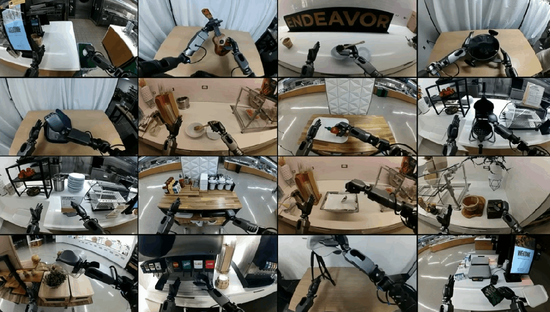 下图是英伟达总部的一个数据收集环节。英伟达有一个咖啡厅,我们设置了这些人形机器人,我们操作它们并收集数据。
