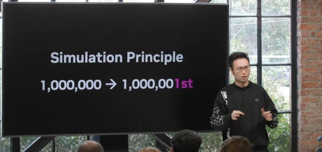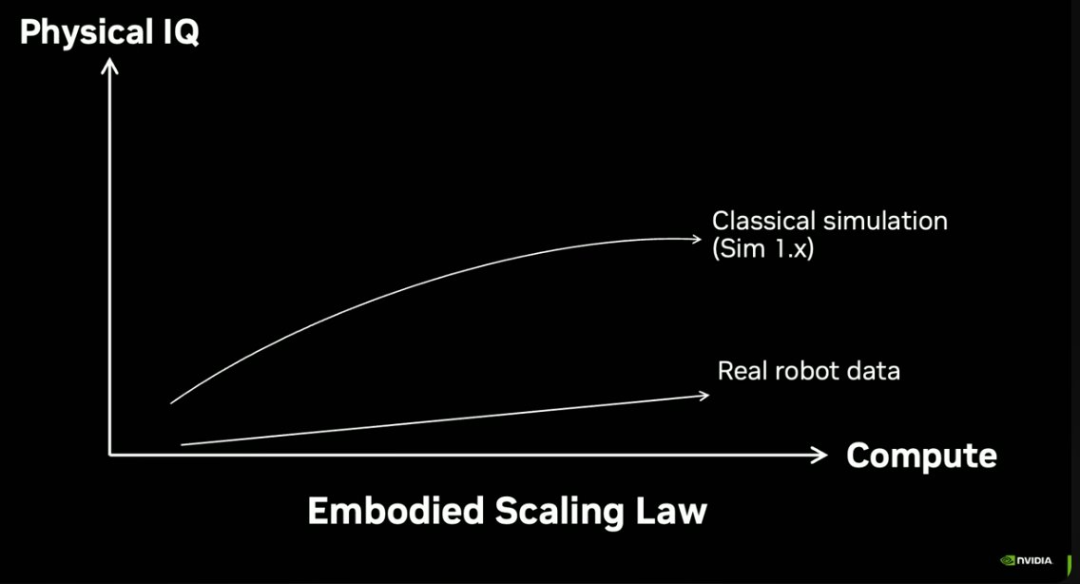 所以,如果我们将其放在这个图表上,纵轴是速度,横轴是模拟的多样性,我们称之为模拟 1.0,数字孪生范式,它是一个经典的向量化物理引擎,你可以运行到每秒 10000 帧甚至一百万帧。但问题是你必须建立一个数字孪生。你需要有人建造机器人,建造环境和一切。这非常繁琐,且需要手动完成。