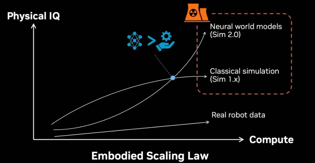 而在神经世界模型的模拟 2.0 时代,物理 IQ 会随计算的扩展而指数级增长。图中的交汇点便是神经网络超越传统图形工程的地方。