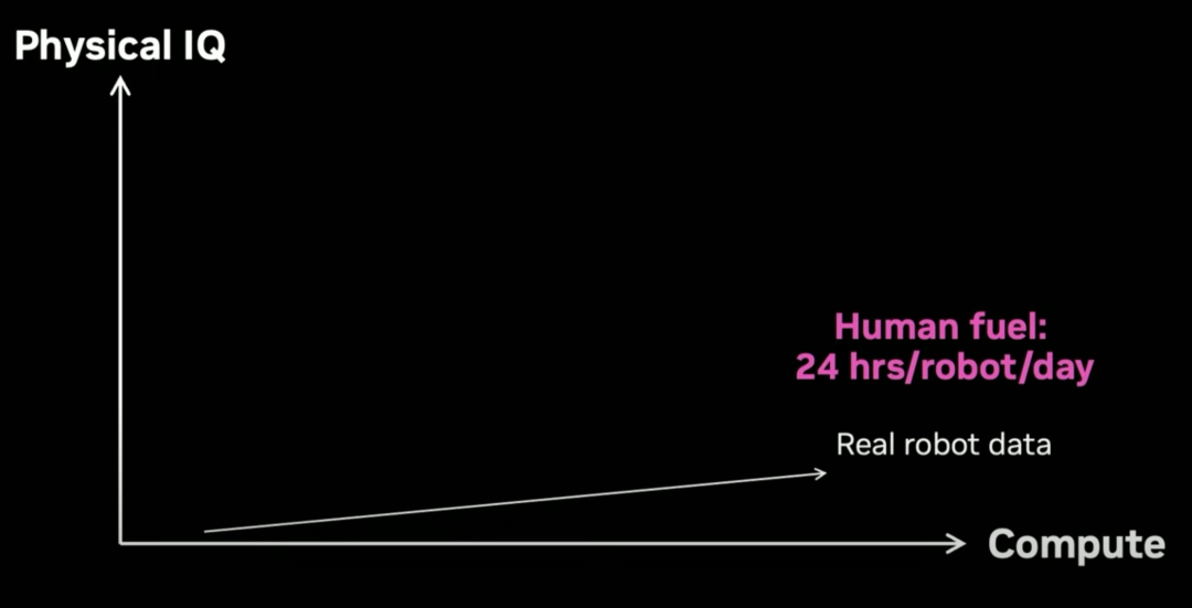 如果你把这个方法放到 scaling 图上,你会发现它根本不能 scale。真实机器人数据的获取是在拿人力当燃料,这比用化石燃料更糟糕。而且,一个机器人每天只有 24 小时的时间可以用。实际可利用的时间更少,因为人会疲劳,机器人比人类更容易疲劳。