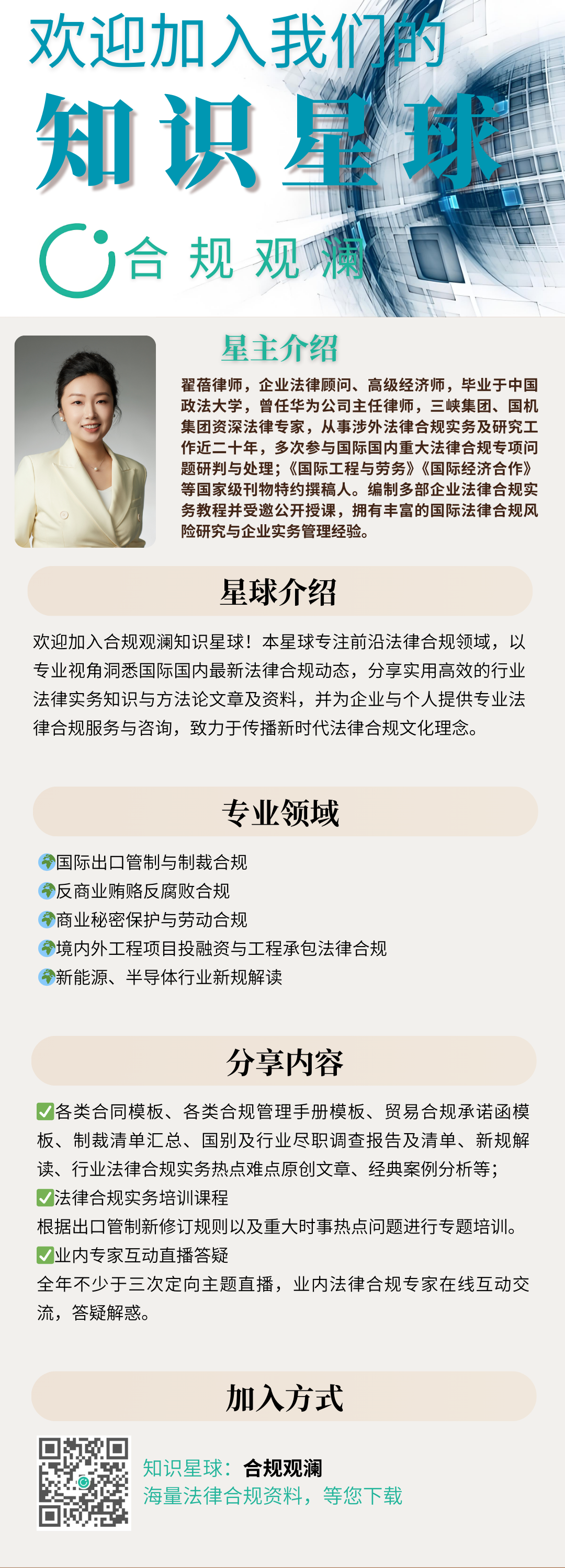 我国通过构建反制裁法律体系、完善司法救济路径,旨在为企业提供日趋成熟的救济机制和多维度的法律依据。有鉴于此,合规观澜应广大粉丝和星球会员需求,特安排此次视频课,对我国现行出口管制与反制裁法律体系做系统介绍;剖析过往多个中国企业涉外国制裁相关经典司法案例;并分享企业事前合规的有效方法以及合规实务工作中的几点误区,意在帮助企业做到有效合规,突破制裁困境。