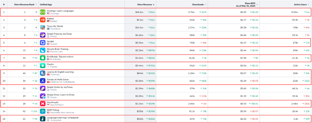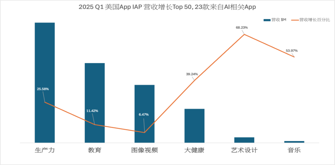 (根据Sensor Tower2025Q1榜单数据整理 数据源:Sensor Tower)“在这六大赛道中,图像视频是AI早期就开始赋能的赛道,因此增长相对有所放缓,大健康、艺术设计以及音乐的整体营收增长百分比较高”,Rock Shi表示到。其中艺术设计方面特别是AI Logo自动生成、AI纹身等在近两年的营收增长非常可观,值得开发者留意。此外具体来看,在生产力工具领域里,文字转语音应用、智能笔记工具这两类应用在美国市场保持着23%的年增长率,前者打破了传统阅读壁垒,并且可以让更多的用户(如阅读障碍用户)因为AI获得更大的福利,以及也可以去满足职场教育等多样化的需求。后者智能笔记工具能做会议纪要或笔记整理等工作,也是目前快速创造营收增长方面比较成功的一条路径。而在教育类中,AI应用则呈现出专业化细分的趋势,比如AI解题类应用、鸟类识别应用等,其中鸟类识别应用和植物识别同属于识别类的细分赛道,虽然小众,但非常值得开发者尝试。此外,自适应学习系统的推出也能很好地提升知识留存率,这些产品在K12教育市场非常受欢迎。