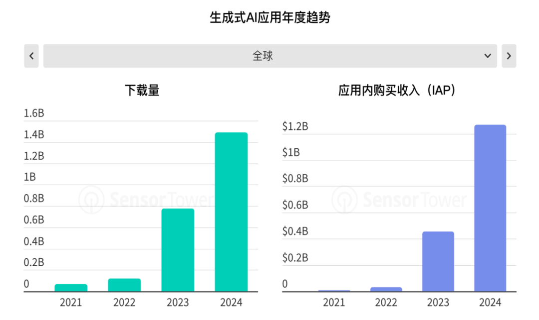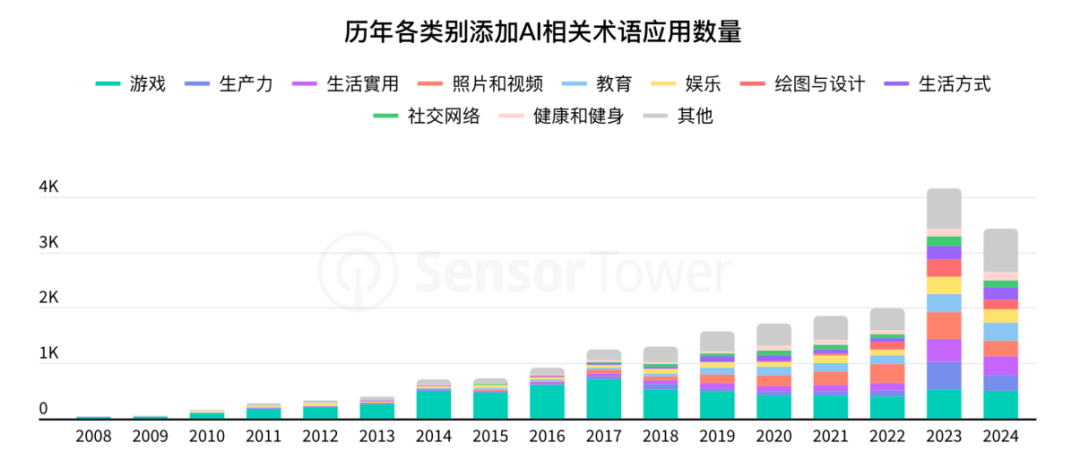 自2023年开始,应用程序的开发人员都会迅速响应人们对AI的兴趣,在应用程序名称或描述中添加 AI 相关术语的应用程序数量相较2022年增加了1倍以上,且随着AI的逐渐发展,甚至更多的应用程序可能会使用 AI 技术,但却不会在其应用程序名称或描述中添加“AI”或“GPT”。在这一背景下,2024年仅统计提及到AI的应用程序下载量也已经达到了170亿次,同时,各大应用厂商也频繁通过在产品中增加或开发出有价值的AI功能来进一步获取增长。比如某社交应用就通过AI角色功能实现月收入6000万的突破,用户停留时长增长25%。