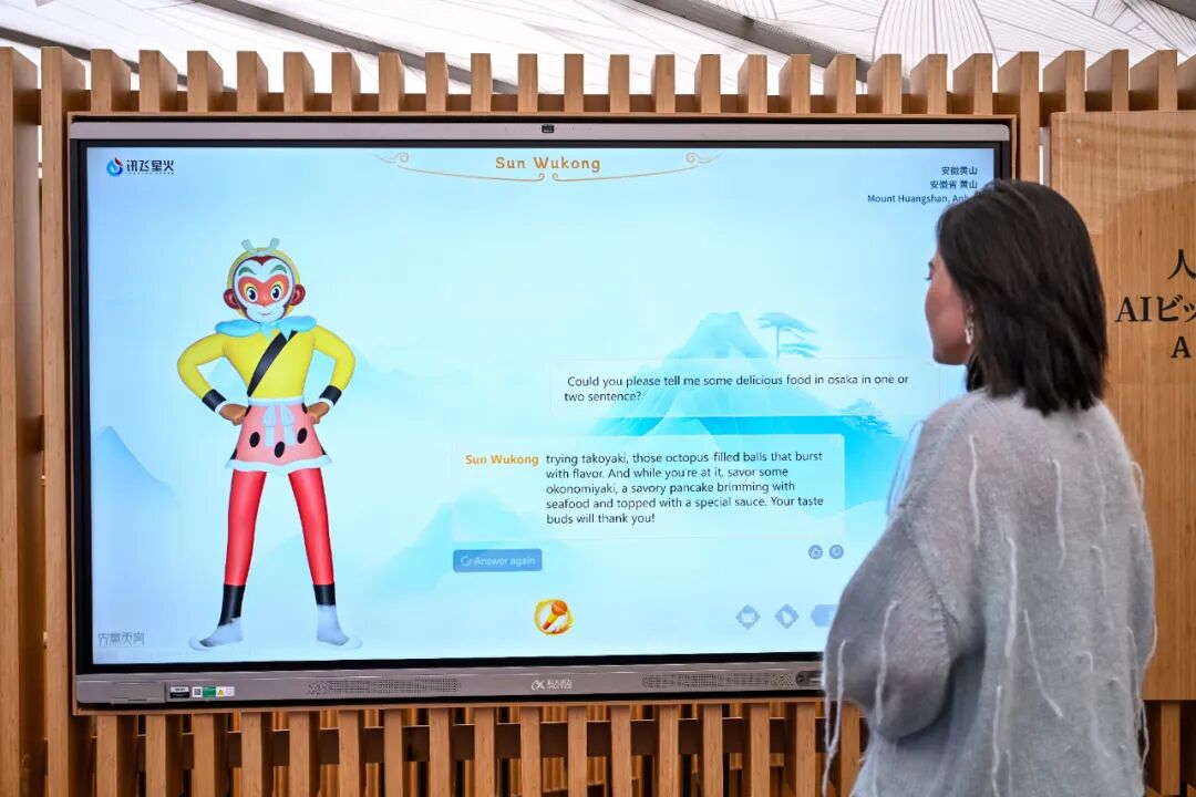 其实,这是大阪世博会中国馆中展出的“人工智能大模型”展项,依托科大讯飞的人工智能技术,让家喻户晓的经典IP孙悟空“活”起来了,它不仅能在中国馆现场与观众跨次元交互对话,还能吟诗作画。