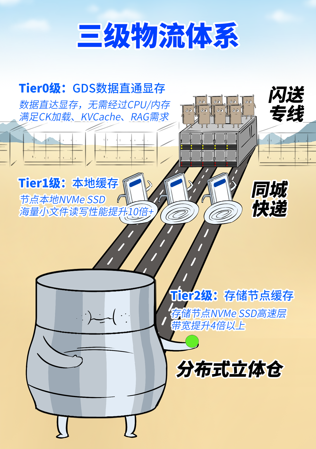 🚀曙光重塑的AI存储架构,采用“三层智能物流系统”,匹配大模型训推不同阶段的数据需求,实现数据分而治之。该架构保证每种操作都按照最优的快递路线进行,从而获得最好的投递结果。