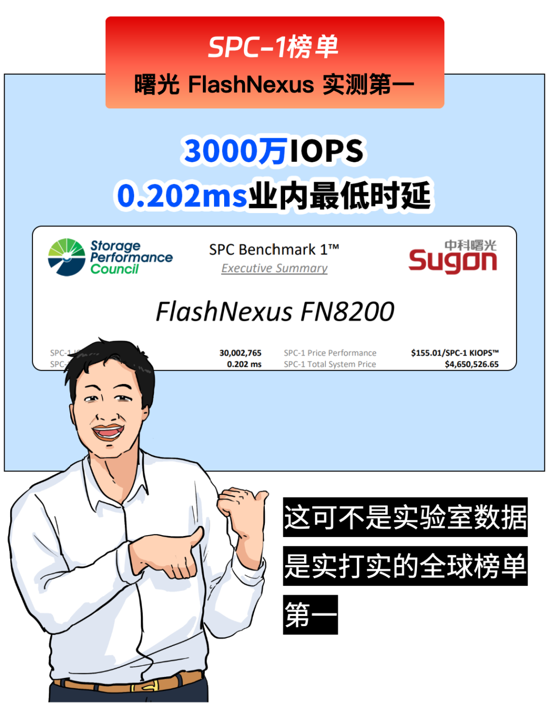 以万卡集群为例,每花1块钱在存储,至少能换回10块钱的GPU算力收益,因为曙光AI全闪存储能GPU利用率提升1倍+。老季的话音刚落,甲方领导又提出了第二个问题。在今年2月25日的SPC-1 V3测试榜单上,它直接干到了依托亿级 IOPS 和毫秒级低延时,可将 token 生成延迟降低高达 80%,整体效率提升超过 50%。讲完了“干大活的 F9000”、“极速飞行的 FlashNexus”,老季正要歇口气。甲方领导又开始发问了——老季早有准备——
