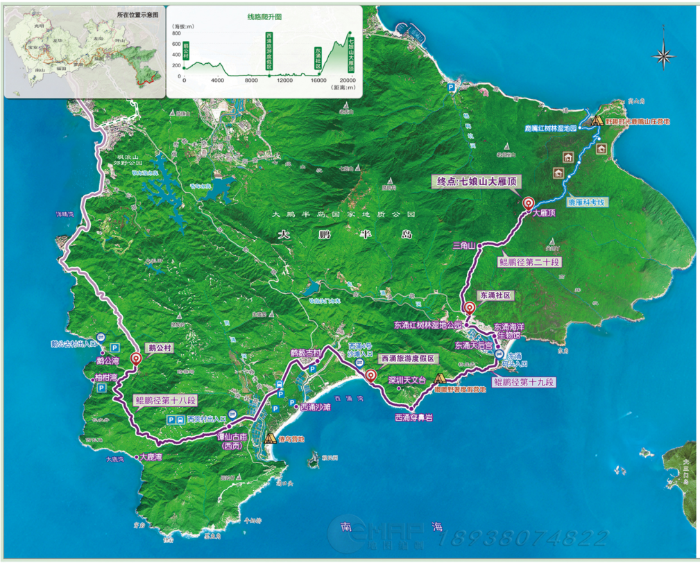 鲲鹏径,深圳远足径主线,全长约200公里。西起凤凰山飞云顶,东至七娘山大雁顶。鲲鹏径分为二十段,穿越山岭、森林、湖泊、溪涧、海岸。西部地势平缓、中部地形复杂、东部山脉密集,串联10余座主要山峰、17个自然郊野公园、8个大型湖库、10个历史人文地、35个城市观景点、9大城市重点发展片区……通山、达海、贯城、串趣。今天,小编就带大家深入了解一下鲲鹏径第十九段!