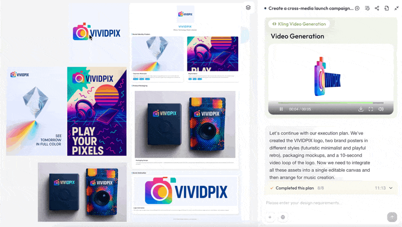 我让它设计一个 "VIVIDPIX "的新生活科技品牌,并创建跨媒体发布活动。