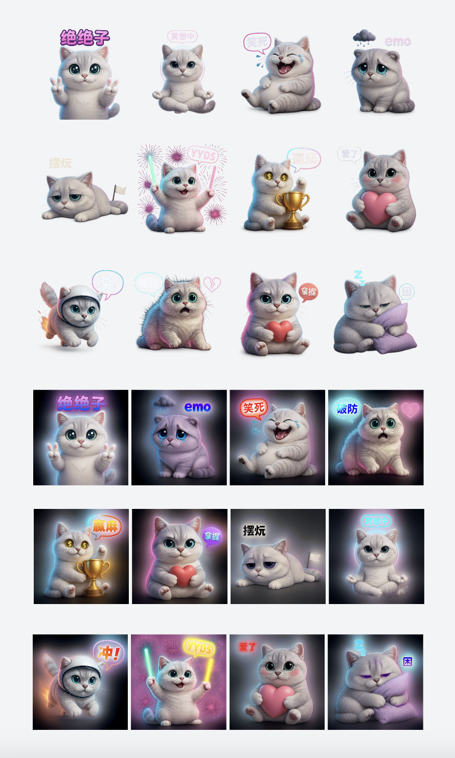比如,我可以让它根据我家猫的照片做一套银渐层表情包,它会自己设计表情,挨个生图,还可以全部编辑,一键做出所有表情包的黑底渐变色版本。