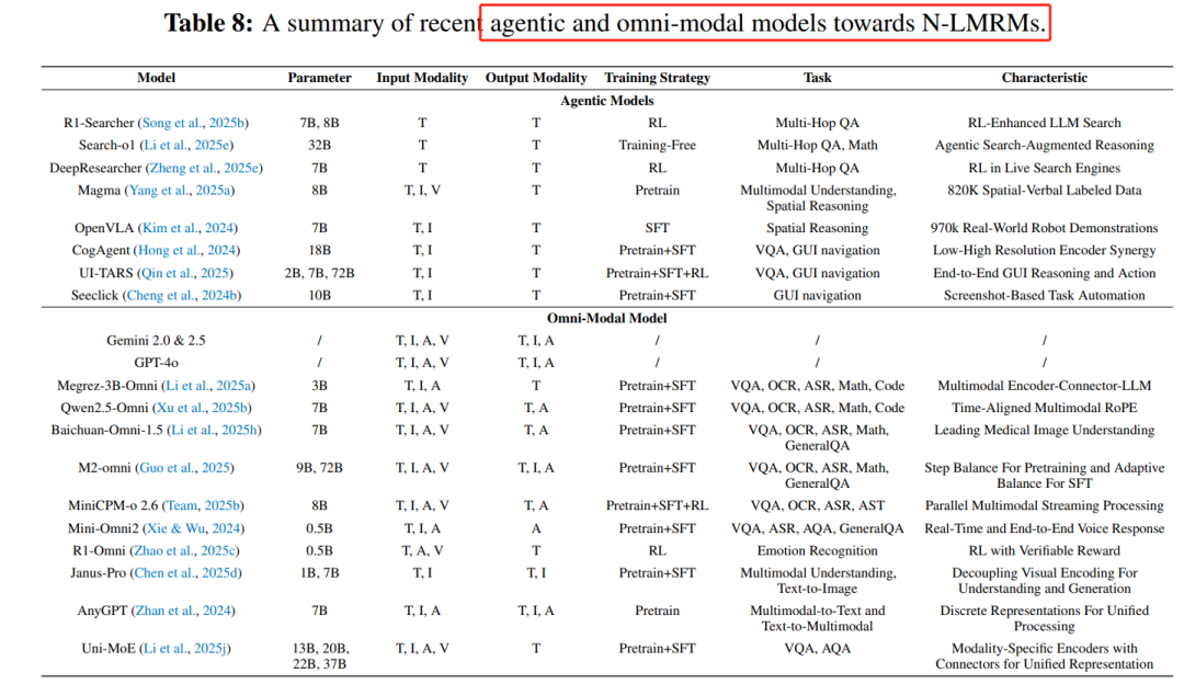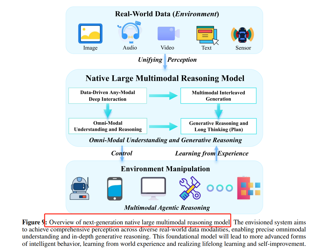 🤖 **迈向原生多模态推理模型:** 为了克服现有模型的局限性,研究者提出了原生多模态推理模型(N-LMRMs)的概念,旨在实现多模态感知、生成和推理的统一架构,关键能力包括Multimodal Agentic Reasoning和Omni-Modal Understanding and Generative Reasoning。