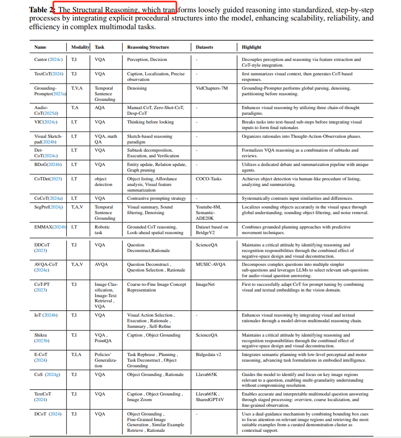Structural Reasoning:通过引入结构化分解推理路径,如Multimodal-CoT(MCoT)和G-CoT(Graph-based CoT),提高模型的推理能力。