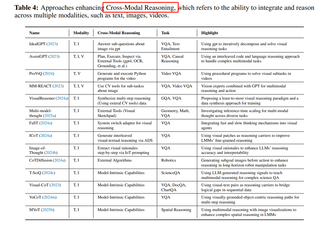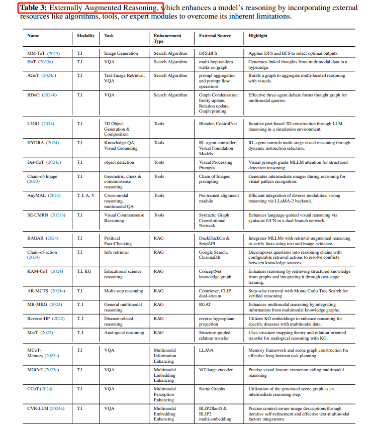 🔗 **以语言为中心的短推理:** 随着大规模多模态预训练模型的出现,多模态推理能力显著提升,主要依赖于表面模式匹配,缺乏动态假设生成和多步逻辑推理能力。Prompt-based MCoT、Structural Reasoning、Externally Augmented Reasoning等方法被提出。