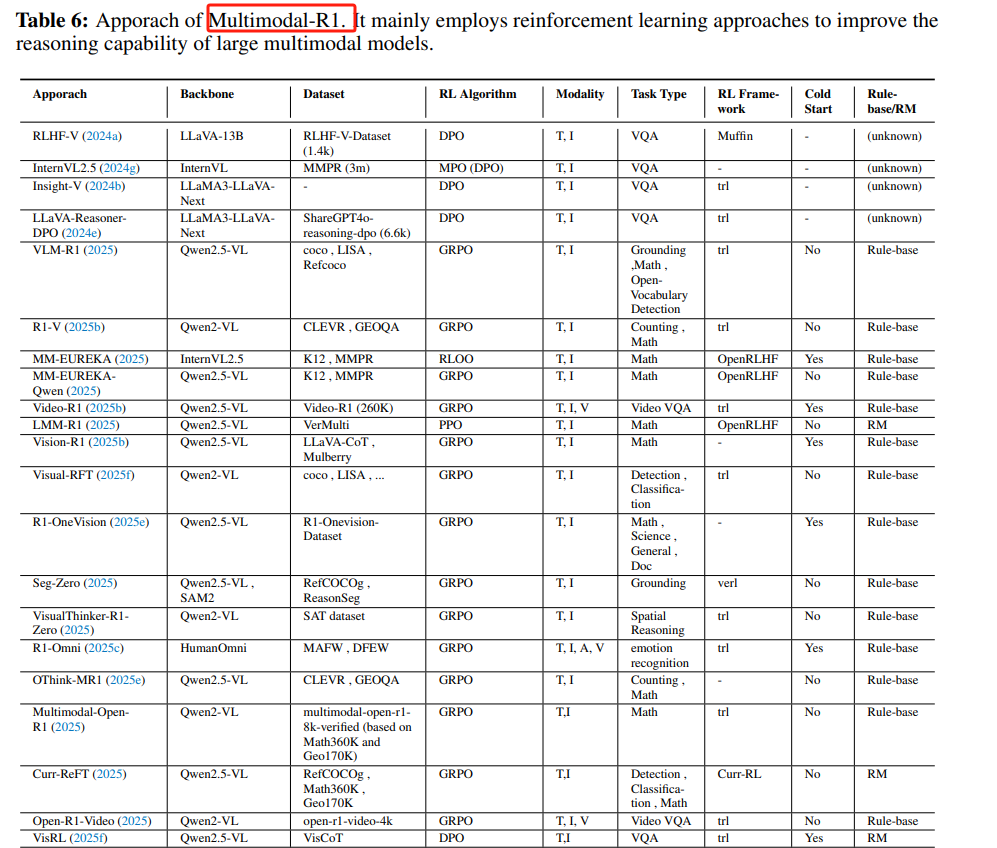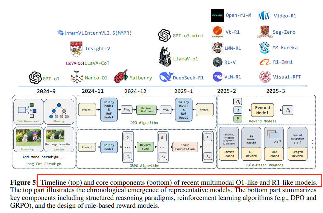 Multimodal-R1:通过强化学习(如DPO和GRPO)增强模型的规划和适应能力,如DeepSeek-R1和R1-OneVision。