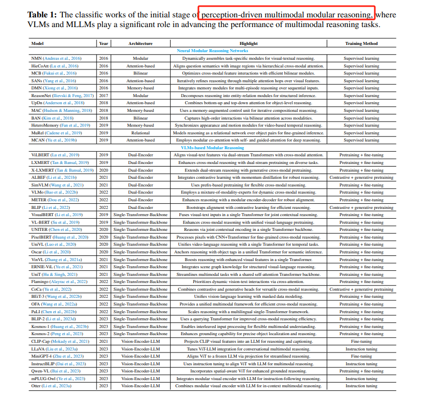 💡**感知驱动的模块化推理:** 早期多模态推理模型采用模块化设计,将推理过程分解为表示、对齐、融合和推理等独立组件,例如NMN和HieCoAtt,但这类模型难以处理复杂的多步推理场景。