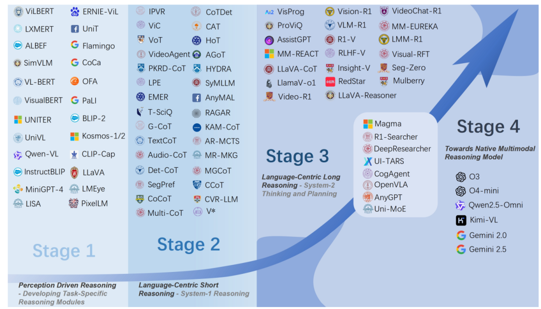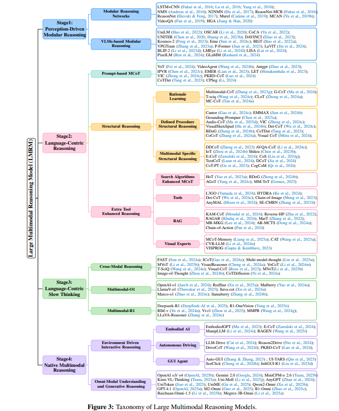 🧠 **以语言为中心的长推理:** 为了处理更复杂的多模态任务,研究者开始探索更深层次的推理能力,包括跨模态推理、多模态O1和R1模型,但这些模型仍然依赖于语言模型的架构,对多模态数据的处理能力有限。