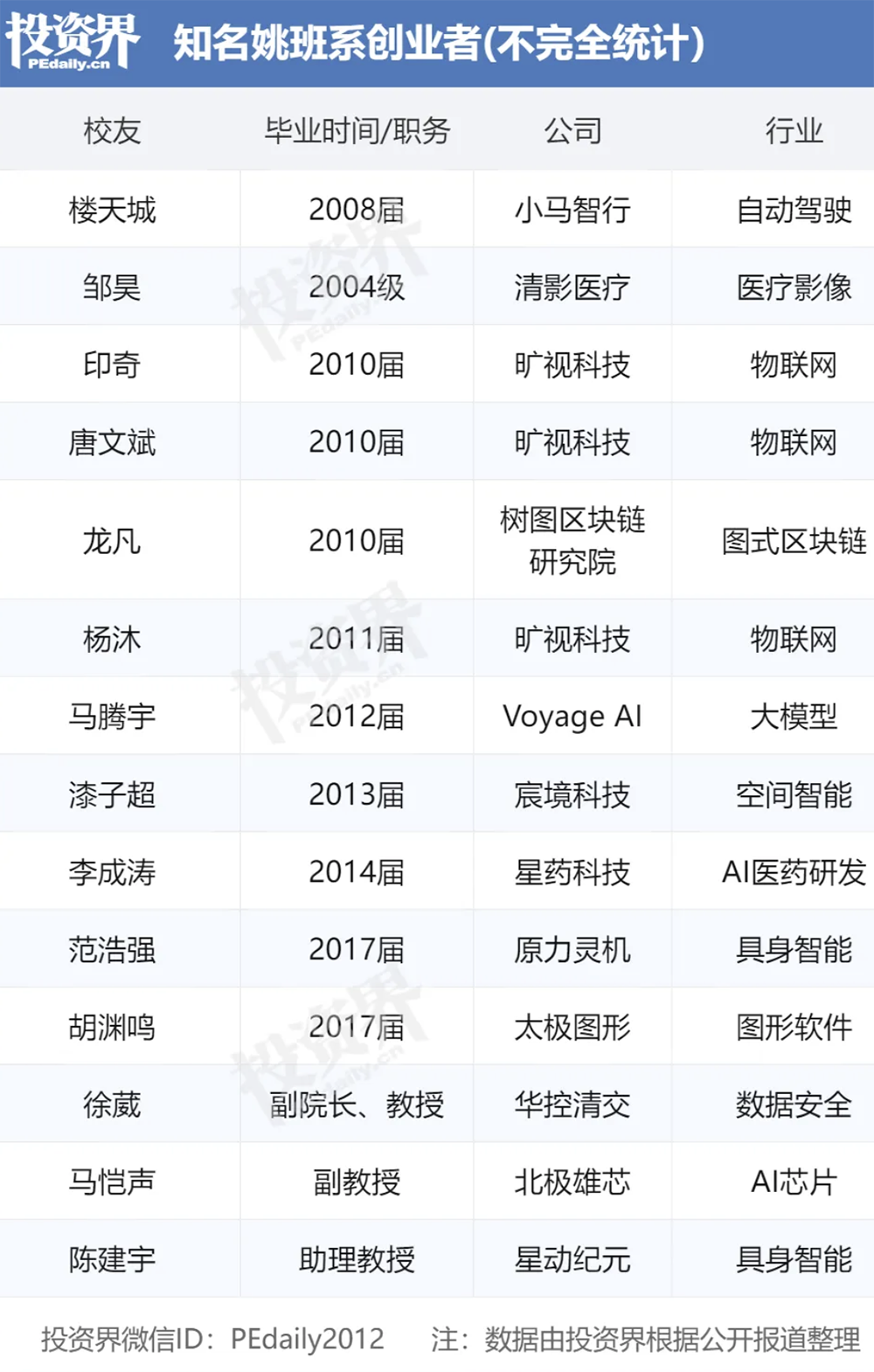 “其实从姚班开班那时起,我们就时刻盯着从这里走出的学生。”一家北京VC合伙人聊起,早在上一波AI浪潮里,姚班系创业者就留给创投圈深刻印象。其中姚班三剑客创办的旷视科技,一度引为创投圈佳话——三位创始人唐文斌、印奇以及杨沐,都是出自姚班的高材生,其中唐文斌、印奇是2006级同班同学。杨沐比他们小一届,他曾经说,"在姚班,解决无人区问题是日常。"后来三人因为一场创业大赛走上创业之路,拉开了姚班系创业的序幕。记得去年11月,小马智行成功美股IPO敲钟。身后掌舵人楼天城,便是姚班大神的代表之一——他于2004年进入清华计算机系就读,机缘巧合下成为姚班首届学生之一,后来又继续师从姚期智攻读博士。不久前,具身智能企业原力灵机完成 2 亿元天使轮融资,集结君联资本、九坤创投、启明创投。公司核心创始团队都曾在旷视科技工作,成员包括范浩强、周而进和汪天才。其中,范浩强 2017 年本科毕业于清华姚班。2010年10月,他还未进入大学,就应清华大学信息学总教练唐文斌的邀请,成为旷视的 6 号员工。大学期间,范浩强不仅在姚班保持着第一名的优异成绩,还在大一军训时完成一篇 ICC 论文。另一位90后学霸胡渊鸣,他在高一就被确定要保送到清华大学,后来经过二次招生,成功进入清华姚班。2017 年 7 月,胡渊鸣作为优秀毕业生从姚班毕业,进入微软亚洲研究院工作,不久后他又入读麻省理工大学(MIT),攻读硕博学位。2020年初,一篇名为“99行代码的《冰雪奇缘》”的文章爆红,让胡渊鸣名震计算机图形学领域。正是凭借这篇文章,他成功拿到红杉中国的天使轮投资,并在2021年创立太极图形。过去几年,联想集团副总裁、联想创投管理合伙人王光熙多次投资了姚班出身的创业者。在他的印象里,早年的姚班创业者多在 AI 发展初期,专注于基础技术研发;新一代创业者处于 AI 技术快速发展和融合阶段,大模型、多模态等技术发展成熟,他们能站在更高的技术起点上。王光熙向投资界总结,姚班学生都拥有扎实的计算机科学和AI理论基础,能够深入理解和掌握复杂的算法、模型等核心技术。“况且姚期智院士强调培养学生回馈社会、为社会创造价值的使命感,这在两代创业者身上都有体现。”