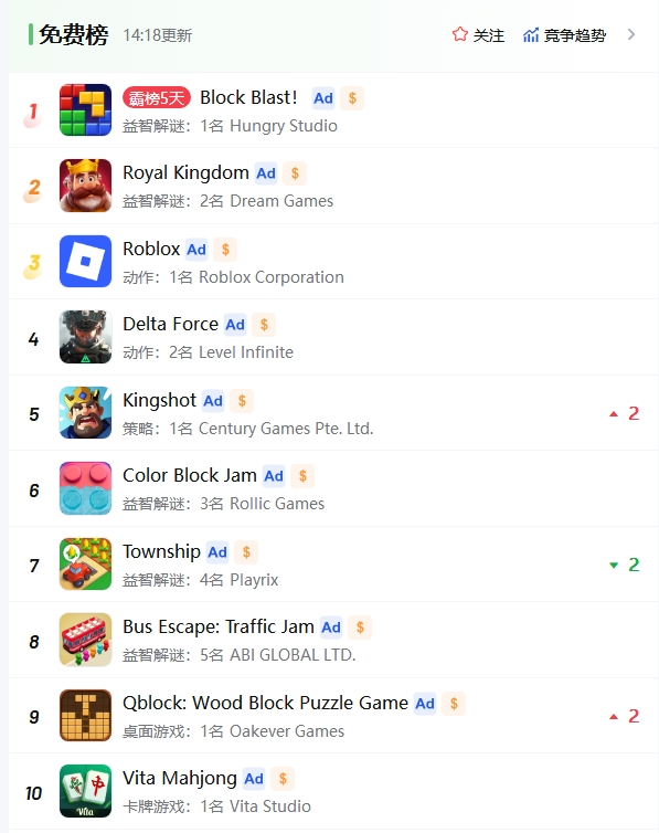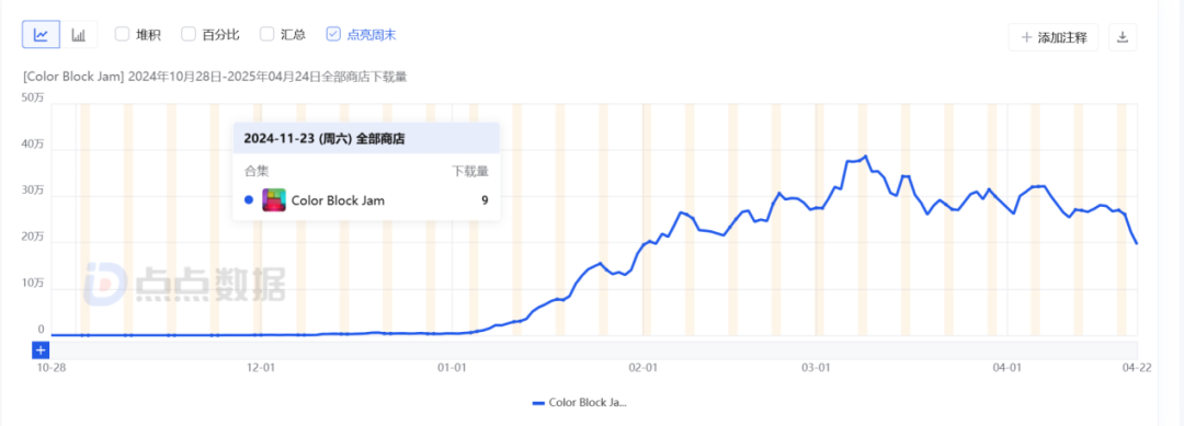 最近两年,休闲类游戏进入美区游戏免费榜并不少见,毕竟休闲游戏主要是靠 IAA 广告变现收入为主,但《Color Block Jam》以休闲游戏的身份进入美区 App Store 畅销榜前 20 却实属罕见。游戏出自土耳其发行方 Rollic Games 之手 ,该公司曾发行过《Twisted Tangle》《Screw Jam》《Hair Challenge》等多个爆款休闲类游戏。我们通过点点数据查询发现《Color Block Jam》在 2025 年第一季度全球的内购收入超 2500 万美元,自 2 月开始,《Color Block Jam》每个月的内购流水均超过 1000 万美金,位居单季度混合休闲游戏营收第一。而产品在 2024 年第四季度的内购营收仅为 17.5 万美元,其成长速度可见一斑。