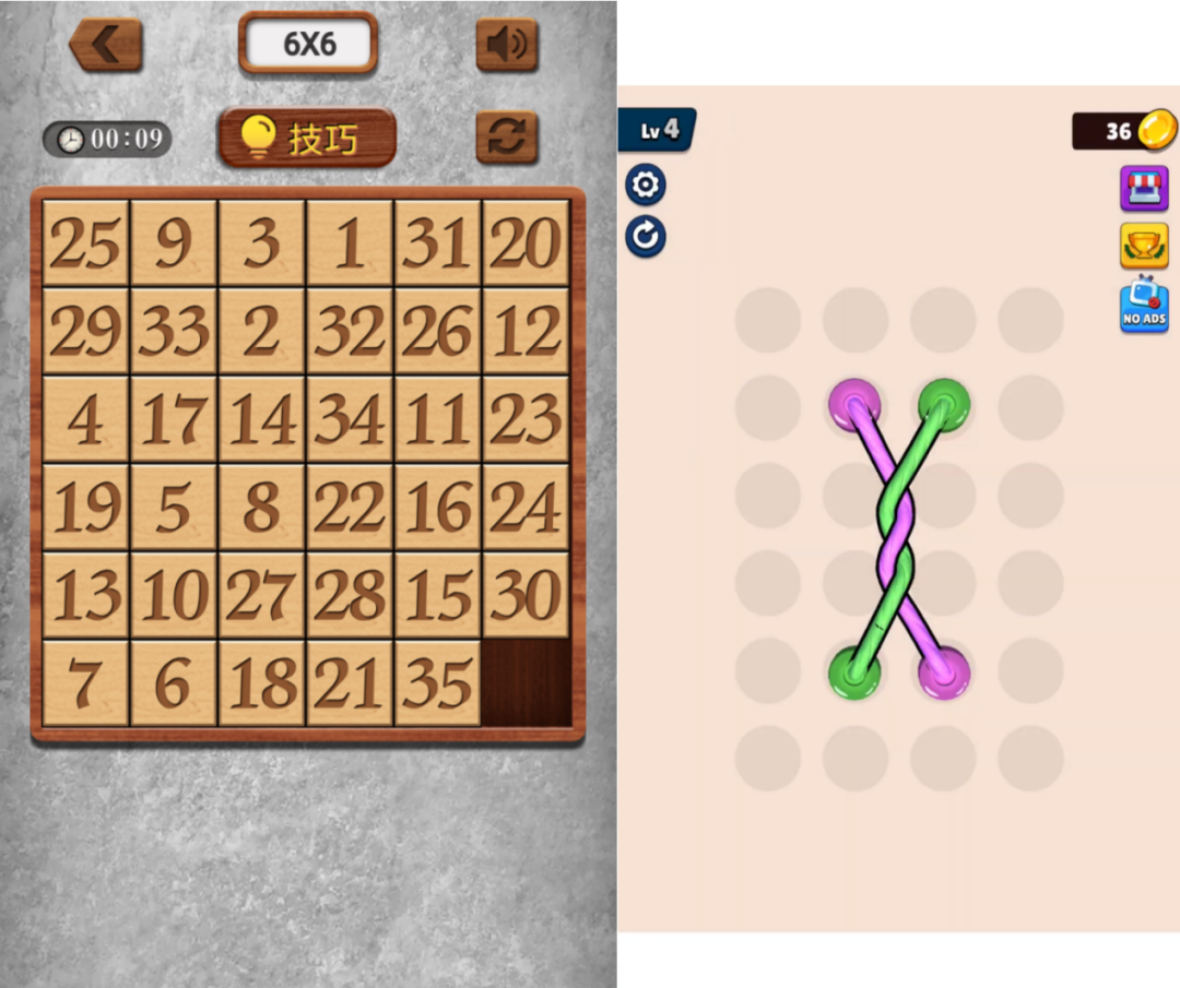 最直观对比传统华容道类游戏来说,《Color Block Jam》之所以在广告阶段会被玩家认为简单,其门道在于可供玩家支配空间及快速辨识。以国内厂商多比特于 2018 年发布的数字华容道类游戏《Numpuz: Classic Number Games》为例,玩家需要在数字大小的基础上,通过对不同数字正方块的移动,将所有数字排列正确的顺序即可通关。整个过程,《Numpuz: Classic Number Games》仅提供 1 个正方块的空间实现,方块能否被挪动取决于上一步的空间是否在其四周。同时,视觉直观性也可以看到,《Color Block Jam》通过颜色对门、积木的分类及面积外观设计,视觉做到极短的快速辨识。对于快速辨识、颜色匹配的运用,则是 Rollic Games 的上一款游戏《Twisted Tangle》。
