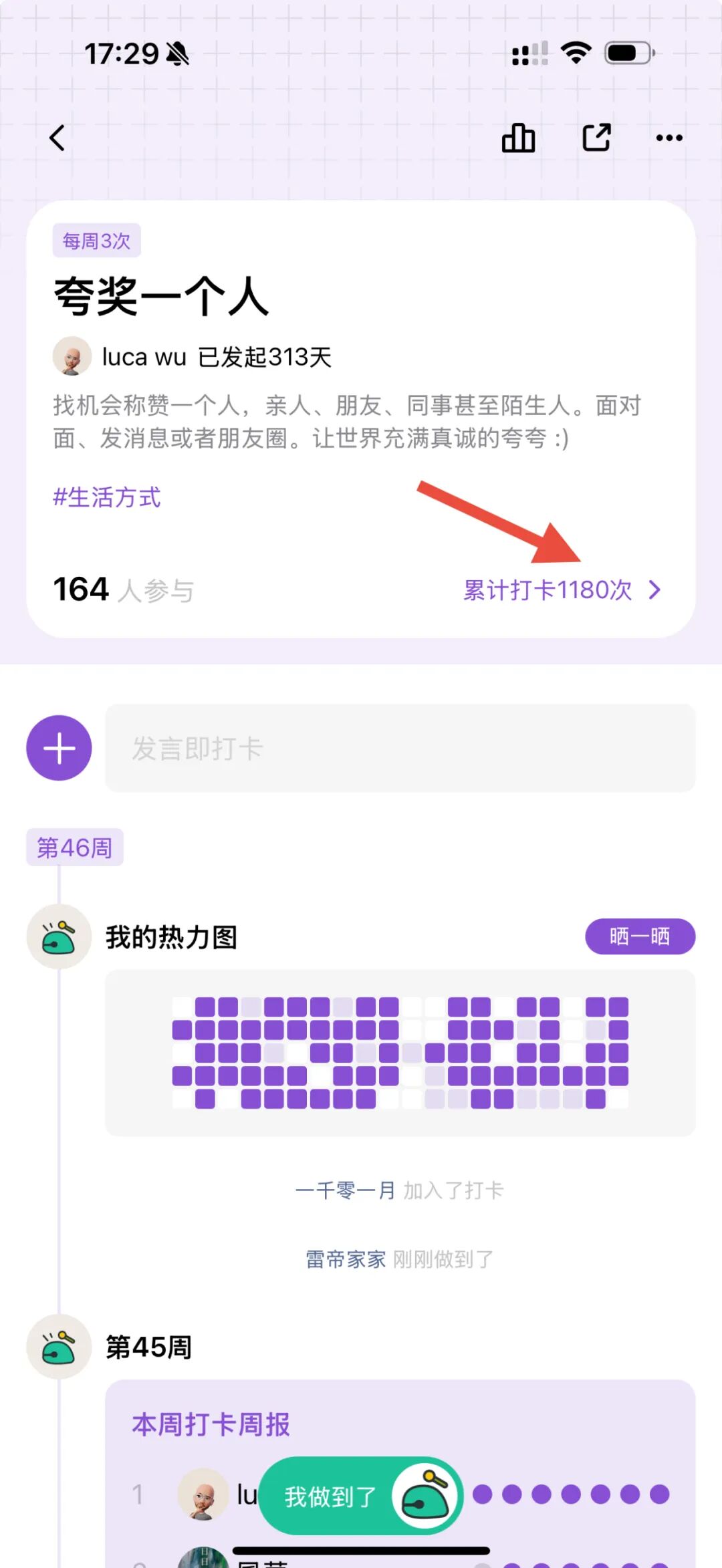 注:以打卡小组右上角的每月打卡数为准,月末减月初,得到本小组当月打卡总数。