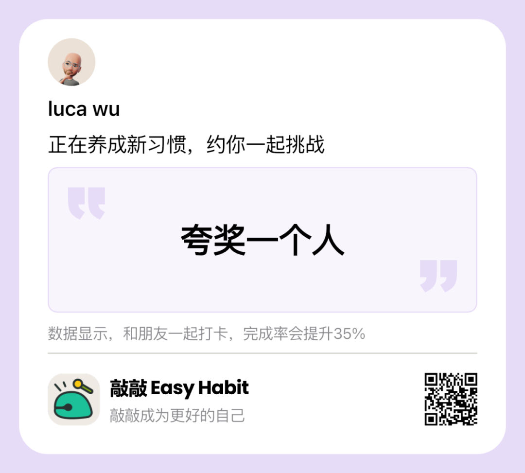 找机会称赞一个人,亲人、朋友、同事甚至陌生人。面对面、发消息或者朋友圈。让世界充满真诚的夸夸 :)