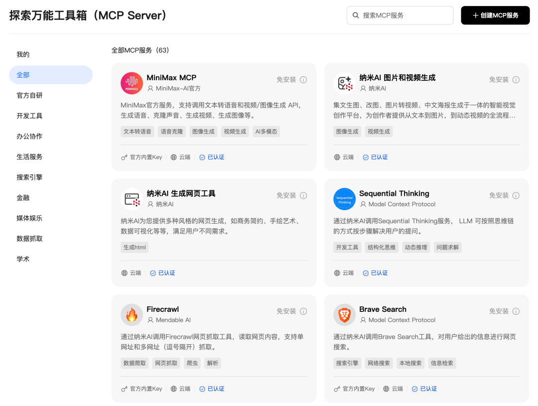在纳米中,常用的 MCP 都被提前买了单,内置了 API Key。