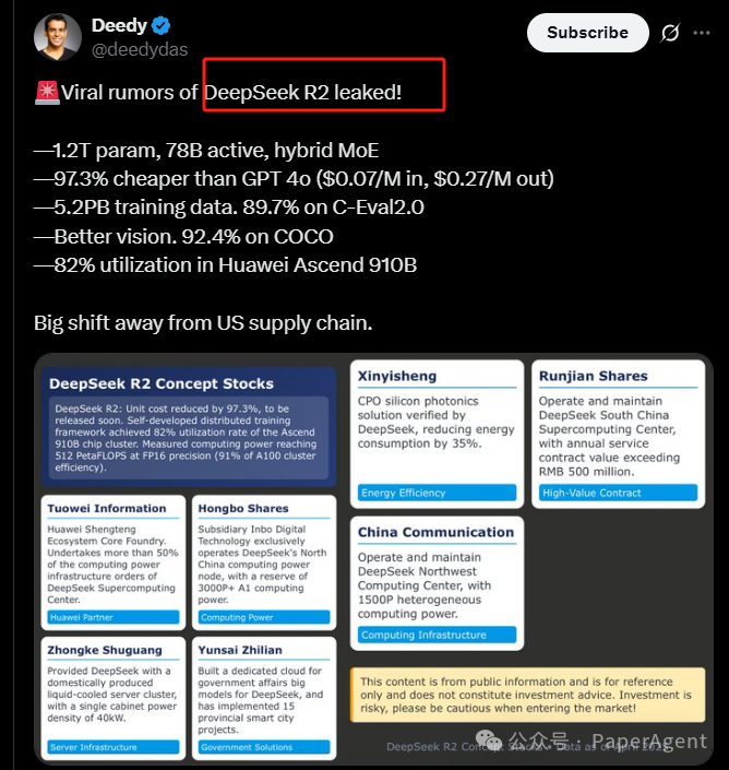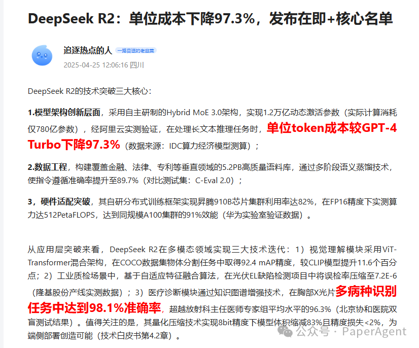 DeepSeek R2的信息泄露,揭示了其强大的性能和极具竞争力的价格。该模型拥有1.2T参数,78B激活,采用混合MoE架构,据称成本比GPT-4o低97.3%。它在C-Eval 2.0上达到89.7%的准确率,在COCO数据集上达到92.4%的视觉准确率。此外,DeepSeek R2在华为昇腾910B芯片上利用率高达82%。如果泄露信息属实,这将对大模型领域产生巨大影响,引发关于AI Agent设计、RAG技术以及多模态Agent系统发展的深入思考。