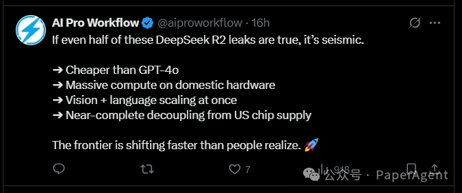 有网友表示如果这些关于DeepSeek R2的信息有一半是真的,那将是震撼性的:更多信息:《动手设计AI Agents:CrewAI版》、《高级RAG之36技》、新技术实战:中文Lazy-GraphRAG/Manus+MCP/GRPO+Agent、大模型日报/月报、最新技术热点追踪解读(GPT4-o/数字人/MCP/Gemini 2.5 Pro)